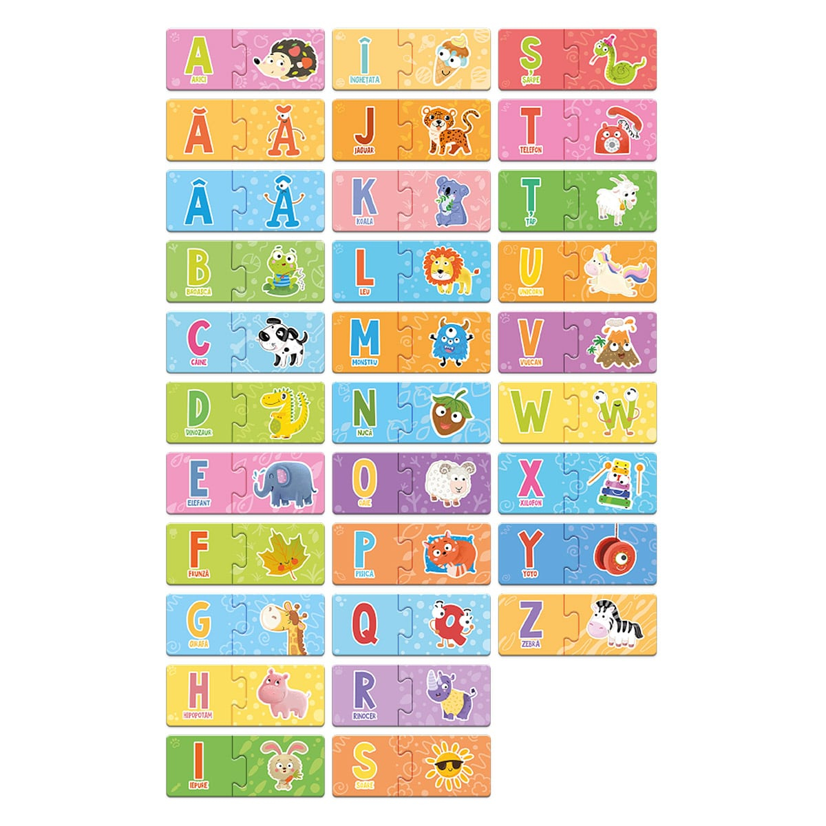 • Setul contine 31 de puzzle-uri, fiecare format din 2 piese – o litera si o imagine sugestiva care incepe cu litera respectiva, usor de recunoscut, care ii ajuta pe copii sa asocieze sunetul cu obiectul corespunzator.