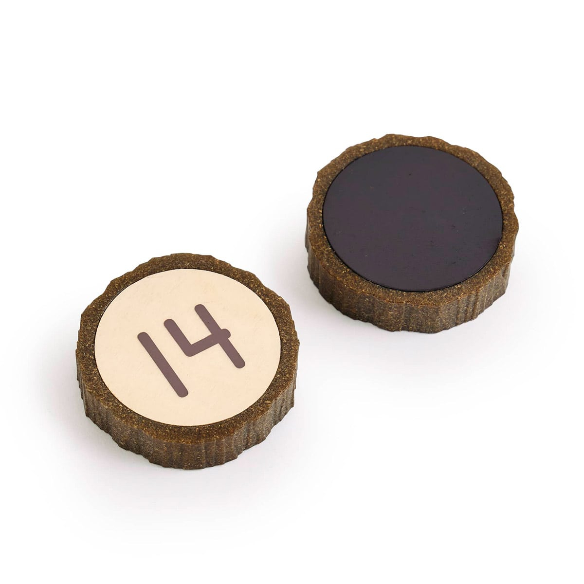 • Setul cuprinde 21 de jetoane cu aspect natural, care imita biscuitii, avand marginile texturate asemanatoare scoartei de copac, imprimate pe o parte cu numere de la 0 la 20 si pe cealalta prevazute cu magnet.