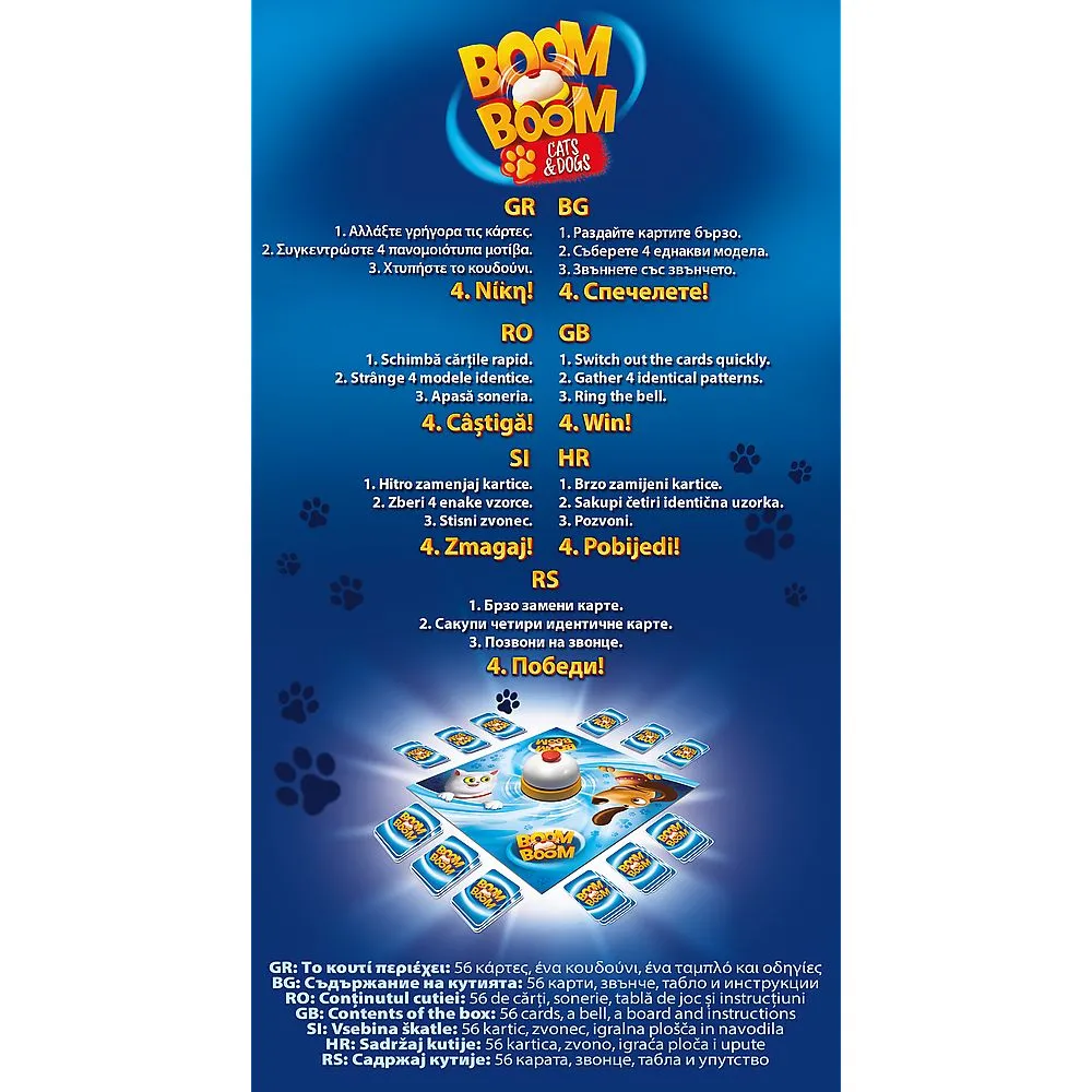 In jocul Boom Boom pisici si catei, jucatorii incearca sa colectioneze seturi de carti cu pisici sau caini. Jucatorii isi schimba cartile cu cele de pe tabla in acelasi timp. Dupa ce prinde patru caini sau pisici identice, jucatorul suna clopotelul pentru a semnala ca un set este gata. Jucatorii pot cauta carti de acelasi tip, facand jocul si mai captivant. Jucatorul care colectioneaza seturi complete de carti cu caini sau pisici este castigatorul.