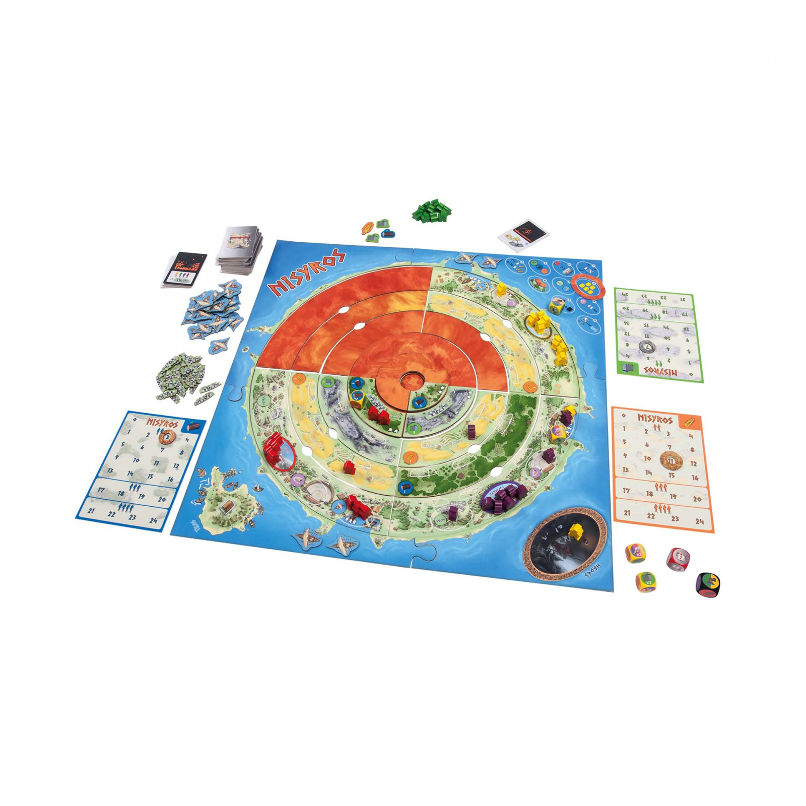 Vulcanul de pe insula greceasca Nisyros se trezeste! Cateva eruptii mari vor acoperi complet insula cu lava. Locuitorii trebuie sa fuga de pe insula construind barci. Ele pot incetini fluxul de lava prin construirea de baraje. Cu toate acestea, cu fiecare noua eruptie, barajele se pot rupe sub presiune, astfel incat lava va continua sa curga in jos. Avem nevoie de lemn pentru construirea de barci, piatra pentru construirea de baraje si grau pentru a hrani muncitorii. Aceste trei resurse pot fi recoltate pe versantii vulcanului. Campurile superioare ofera cel mai mare randament, dar acestea vor fi in curand acoperite cu lava. Uneori, lucratorii isi asuma riscuri uriase pentru a aduna suficiente resurse. Vom reusi sa salvam locuitorii inainte ca insula sa fie complet acoperita cu lava? Vulcanul Nisyros este un joc de strategie dinamic care isi pastreaza tensiunea pe tot parcursul jocului datorita evenimentelor sale surprinzatoare. Este usor de invatat si nivelul de provocare poate fi ridicat pas cu pas. Acest lucru face ca jocul sa fie potrivit atat pentru jucatorii ocazionali, cat si pentru pasionatii de jocuri. Contine: tabla de joc formata din 25 de parti, 40 figurine de joc din lemn, 7 zaruri speciale, 3 matrice de resurse, 32 barci, 32 baraje, 25 carti de eveniment, reguli de joc. Varsta recomandata: 12-99 ani; Numarul de jucatori: 2-4; Durata: ~45-60 minute. Dimensiuni: 31.5 x 22.7 x 3.9 cm.