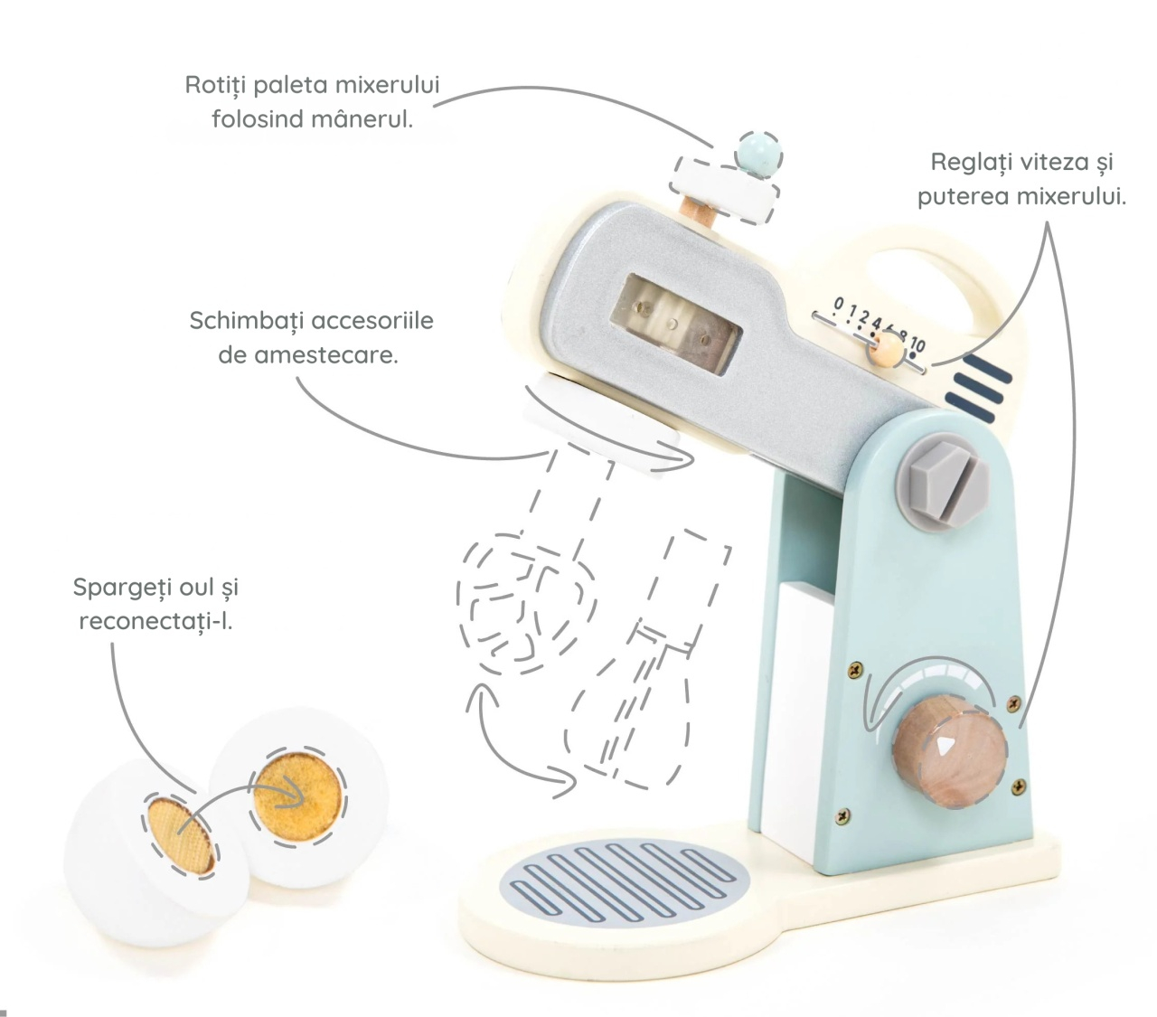 Joc de rol Mixer cu accesorii, UMU Toys Mixer din lemn pentru copii, cu design realist si accesorii pentru gatit. Rotirea butonului si schimbarea paletelor incurajeaza dezvoltarea abilitatilor motorii fine si coordonarea mana“ochi. Copiii se vor distra descoperind cum functioneaza un mixer adevarat, invartind aluatul imaginar cu precizie si entuziasm. Fiecare ingredient adauga o doza de creativitate: faina, zaharul, ouale si laptele ii ajuta pe cei mici sa se joace de-a cofetarii si sa inventeze prajituri si deserturi delicioase. Ce contine reteta? Cate oua punem? Lapte rece sau cald? Mixerul devine rapid piesa centrala din bucataria copiilor. Jocul de rol cu ingrediente si ustensile este o ocazie excelenta de a invata despre munca in echipa, impartirea sarcinilor si bucuria de a gati pentru cei dragi. ii ajuta pe copii sa inteleaga ce inseamna grija, atentia si satisfactia de a darui cuiva ceva facut de ei. Ideal pentru jocuri individuale sau in familie, mixerul se potriveste perfect cu alte accesorii de bucatarie. Copiii pot coace prajituri pentru o aniversare imaginara, pot pregati micul dejun sau pot organiza o petrecere cu ceai si deserturi dulci. 🎠Cadou ideal pentru zile de nastere, Craciun, Paste sau Ziua Copilului. Setul contine 10 piese: mixer cu bol detasabil, doua palete interschimbabile, doua jumatati de ou, cutie de lapte, saculet cu faina, saculet cu zahar, bilute de aluat din fetru. Toate piesele sunt solide, cu margini rotunjite si prietenoase cu cei mici. Varsta recomandata: +3 ani 🌱 Confectionat din lemn cu vopsele ecologice pe baza de apa. Conform EN71 & ASTM, cu certificare CE AVERTISMENT: Contraindicat copiilor sub 3 ani. Se recomanda supravegherea copilului in timpul jocului. Produs in China pentru UMU Toys, Cehia.