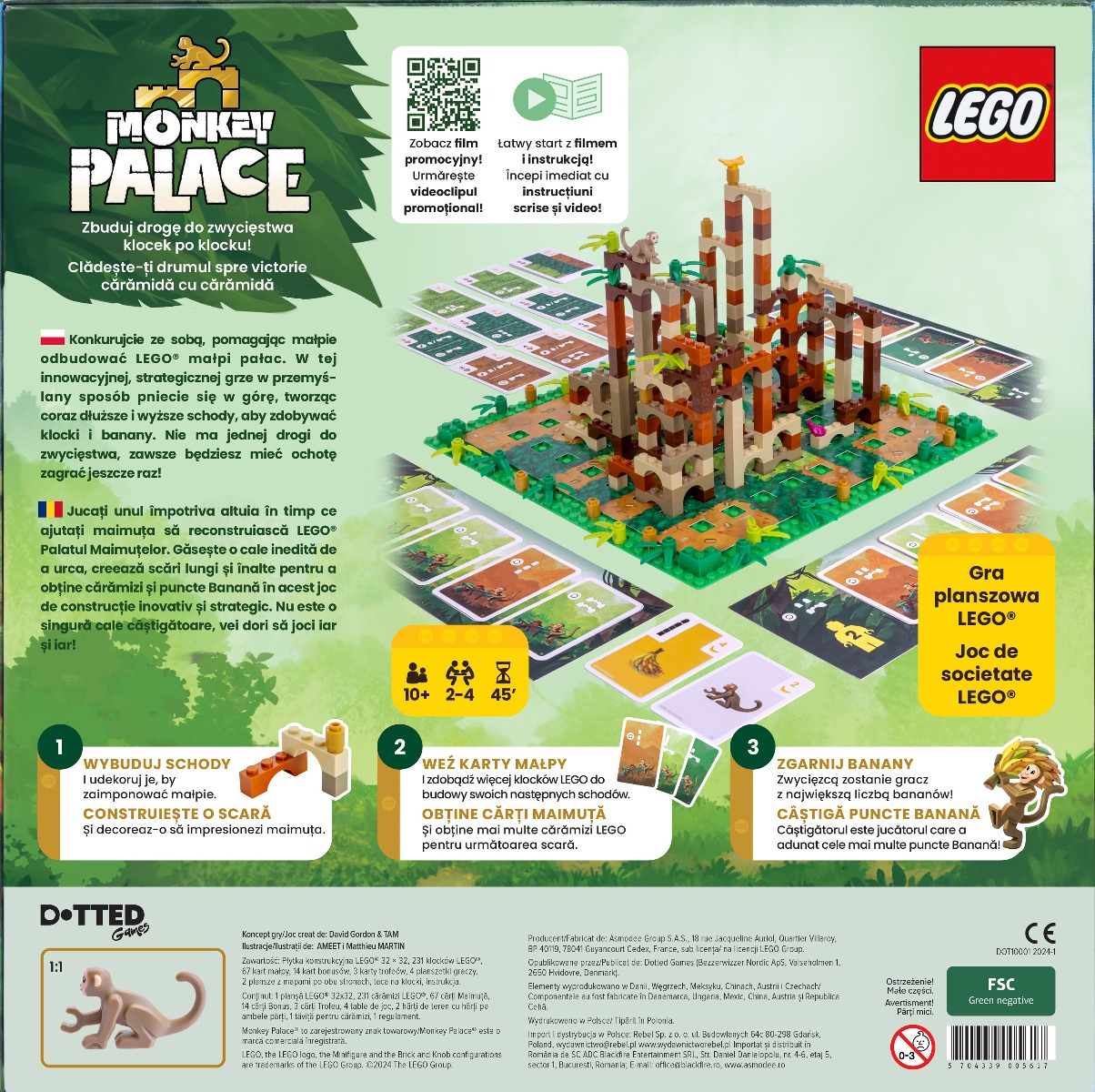 Jucati unul importiva altuia in timp ce ajutati maimuta sa reconstruiasca LEGO Palatul Maimutelor. Gaseste o cale inedita de a urca, creeaza scari lungi si inalte pentru a obtine caramizi si puncte Banana in acest joc de constructie inovativ si strategic. Nu este o singura cale castigatoare, vei dori sa joci iar si iar! Continut: 1 plansa LEGO 32x32, 231 caramizi LEGO, 67 carti Maimuta, 14 carti Bonus, 3 carti Trofeu, 4 table de joc, 2 harti de teren cu harti pe ambele parti, 1 tavita pentru caramizi, 1 regulament. 2-4 jucatori. Durata de joc: +45 min. Varsta recomandata 10+ ani