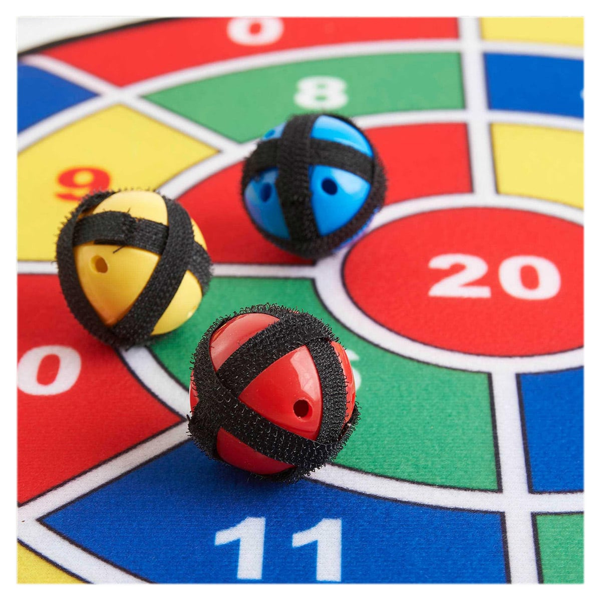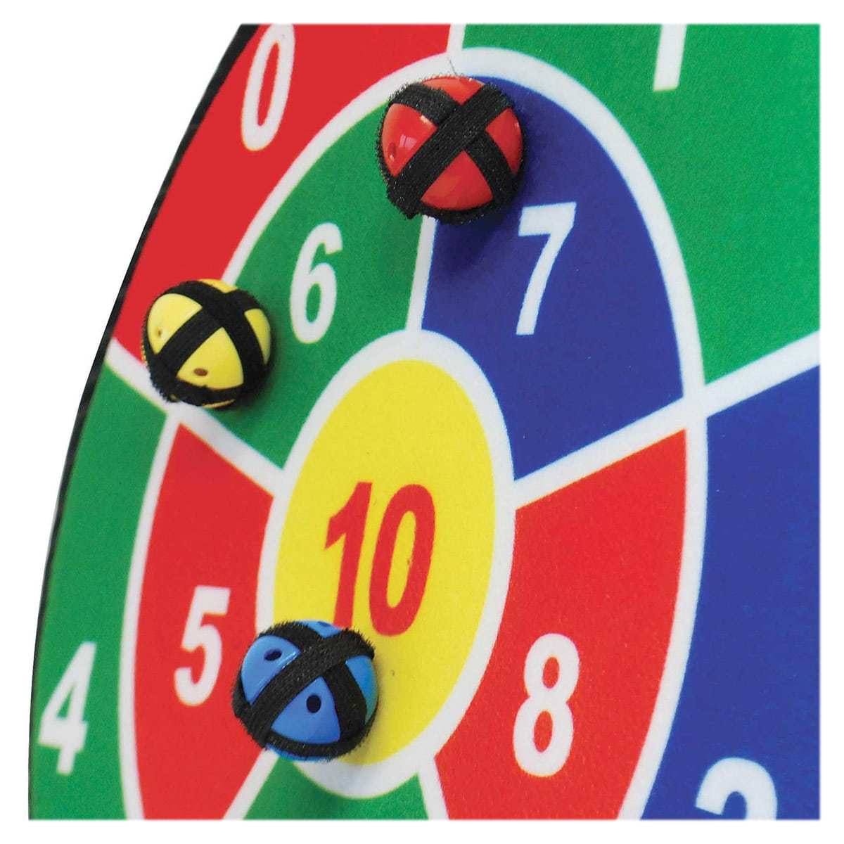 • Setul include: 3 table cu diametrul de 45 cm (10–100, 0–10, 0–20) si 9 mingi usoare cu sistem cu banda velcro, care se fixeaza pe tabla.