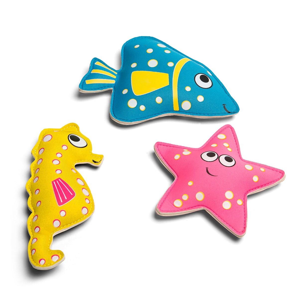 - Setul contine trei animale subacvatice distractive (stea de mare, peste, calut de mare) realizate din neopren si umplute cu nisip.