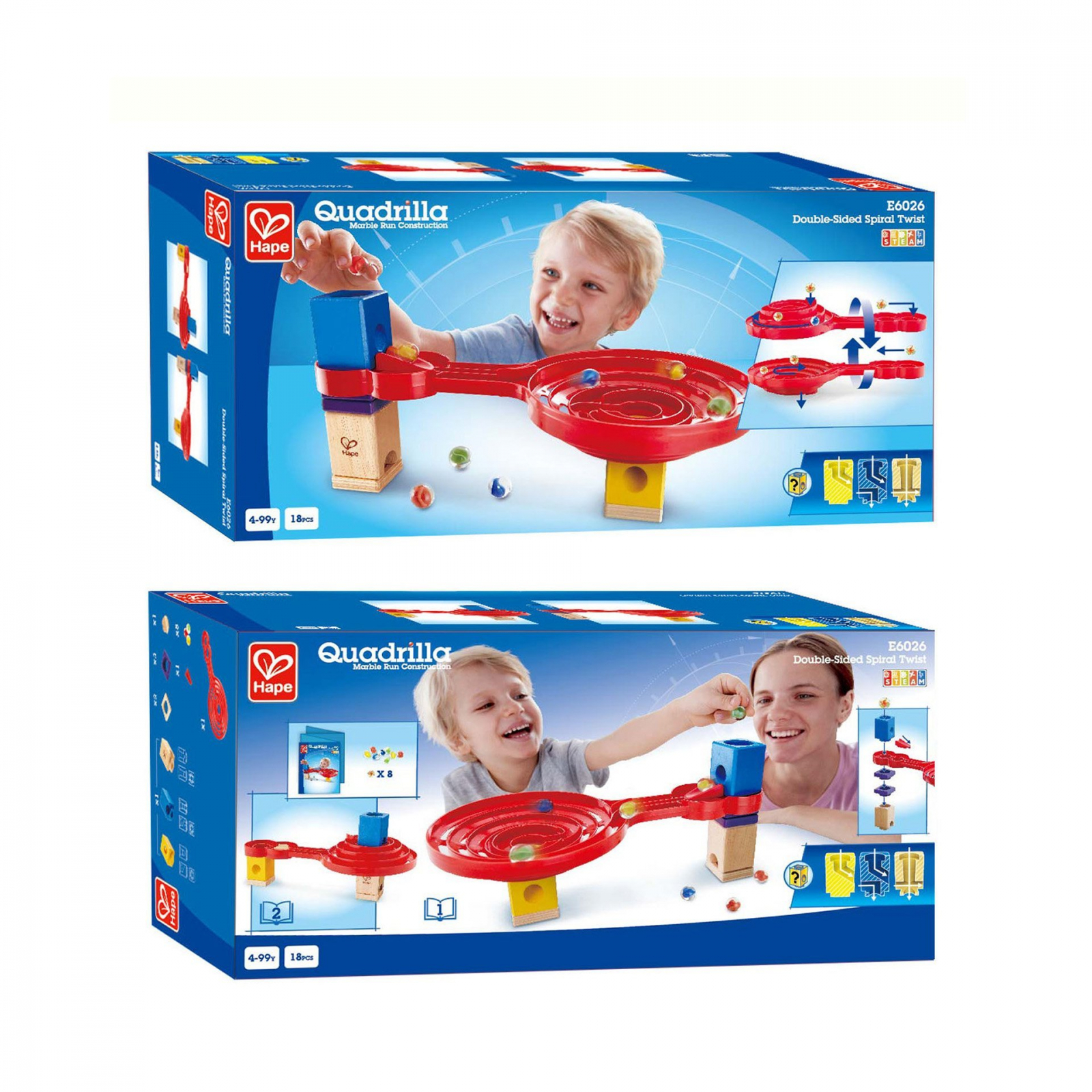 Obtineti de doua ori invartirea din setul Quadrilla cu aceasta uimitoare spirala dubla. Atat laturile concave, cat si cele convexe prezinta piste spiralate, dubland potentialul de joc. Cand spirala are fata concava in sus, bila va aluneca de la brat in inelul exterior si va cobori rapid spre centru. Cu partea convexa in sus, fluxul de bila este inversat. O bila aruncata in centru se deplaseaza rapid din centru catre inelul exterior si brat. Setul include o spirala pe doua fete, trei blocuri de distributie din lemn, un obturator de gauri, un accelerator, doua inele stabilizatoare si doua reglaje de inaltime, opt bile. Ajuta la dezvoltarea gandirii spatiale si la intelegerea principiilor stiintei, tehnologiei, ingineriei, artei si matematicii. De asemenea, va dezvolta gandirea cognitiva a copilului si va imbunatati intelegerea relatiilor dintre cauza si efect care exista. Palniile spiralate creeaza mai mult timp de rulare si va aduc mai aproape de actiune. Atrapatorul de bilele scoate un zgomot de vartej si opreste biletele sa fuga la sfarsitul fiecarei curse. Crearea fiecarui bloc de culoare pentru un scop diferit stimuleaza si incurajeaza gandirea logica si inginereasca la copii. Jucaria este realizata din lemn durabil si vopsele non-toxice pe baza de apa, ceea ce o face alegerea perfecta. Dimensiuni: L: 36, l: 11, H: 18 cm.
