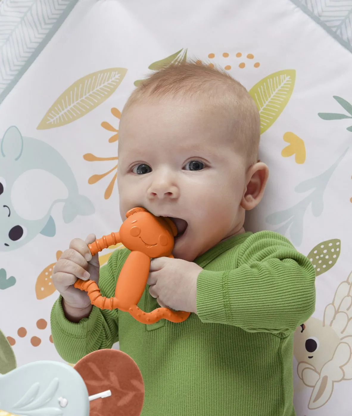 Jucarie de dentitie cu animale si inele flexibile special concepute pentru a prinde si rasuci manutele mici. Inele de dentitie fara BPA. Ajuta la imbunatatirea abilitatilor motorii fine si la dezvoltarea senzatiilor pentru bebelusii cu varsta de 3 luni si peste. Acest pachet contine jucaria de dentitie pentru bebelusi in forma de gandacel portocaliu.