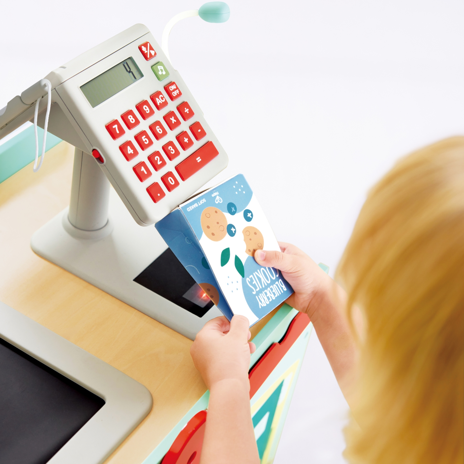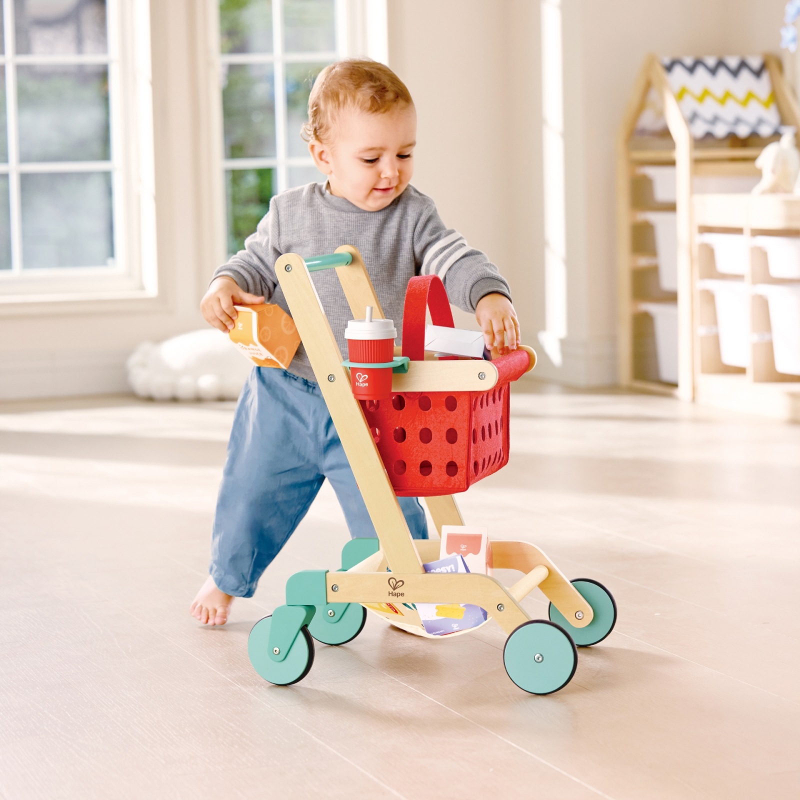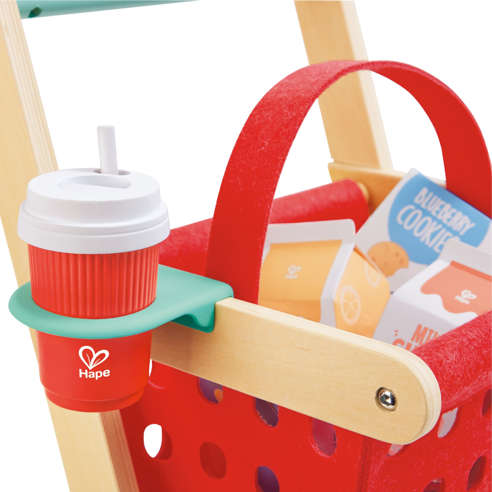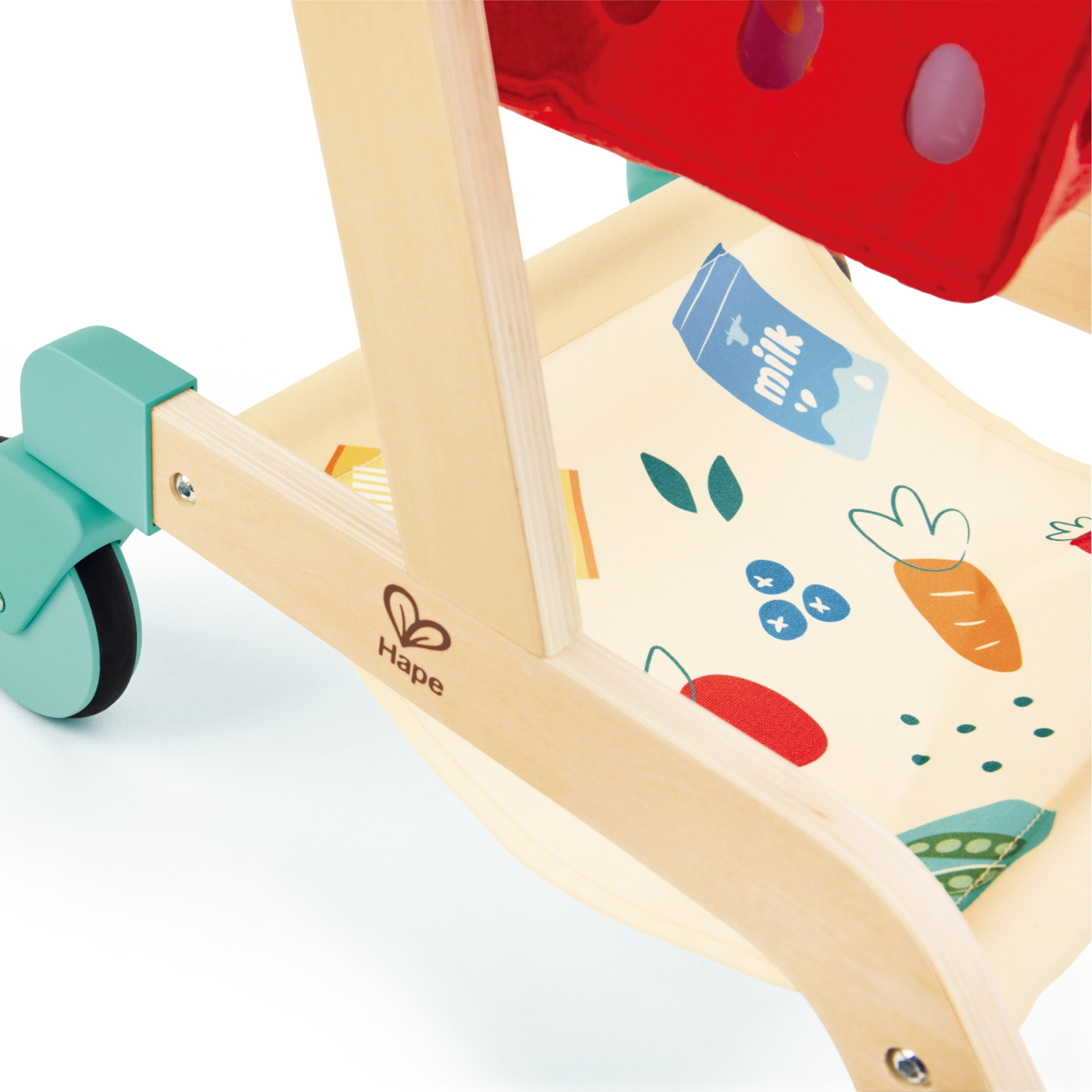 Un carucior de cumparaturi din lemn cu roti rotative de 360°, un cos detasabil si un design durabil pentru o joaca imaginativa nesfarsita._x000D_ _x000D_ Acest carucior de cumparaturi de jucarie are roti netede cu mobilitate la 360 de grade, facilitand manevrarea copiilor prin casa, bucurandu-se in acelasi timp de o experienta realista de cumparaturi._x000D_ _x000D_ Caruciorul include un cos portabil din fetru cu sistem de inchidere cu carlig, oferind optiuni de joaca versatile si facilitand transportul articolelor in timpul jocului imaginativ._x000D_ _x000D_ Fabricat cu un cadru durabil din lemn, acest carucior combina eleganta cu stabilitatea, asigurand un plus fiabil si elegant pentru orice moment de joaca. Conceput pentru a promova motricitatea grosiera, limbajul si abilitatile sociale in timp ce copiii isi imping caruciorul si interactioneaza cu „negustorii” si alti „clienti”._x000D_ _x000D_ Un suport pentru pahare la indemana poate fi atasat pe partea laterala din lemn a caruciorului, oferind o modalitate practica de a transporta bauturi alaturi de alimente. Complet cu patru produse alimentare, acest carucior de cumparaturi este companionul ideal pentru magazinul de joaca Hapeu2019. Codurile scanabile de pe pungi imbunatatesc experienta interactiva, permitand copiilor sa utilizeze scanerul magazinului de joaca pentru mai multa distractie si implicare. Umpleti caruciorul cu jucarii sau mancare imaginara si bucurati-va de o sesiune distractiva de cumparaturi prin casa - folositi cosul detasabil pentru articole mai mici sau pentru a cara cumparaturi acasa. Numarati si sortati articolele pentru o distractie suplimentara la invatare. Este o aventura grozava!_x000D_ _x000D_ Dimensiuni: L: 46, l: 35.6, H: 58 cm,_x000D_ Dimensiuni cutie: L: 47, l: 36, H: 8 cm.
