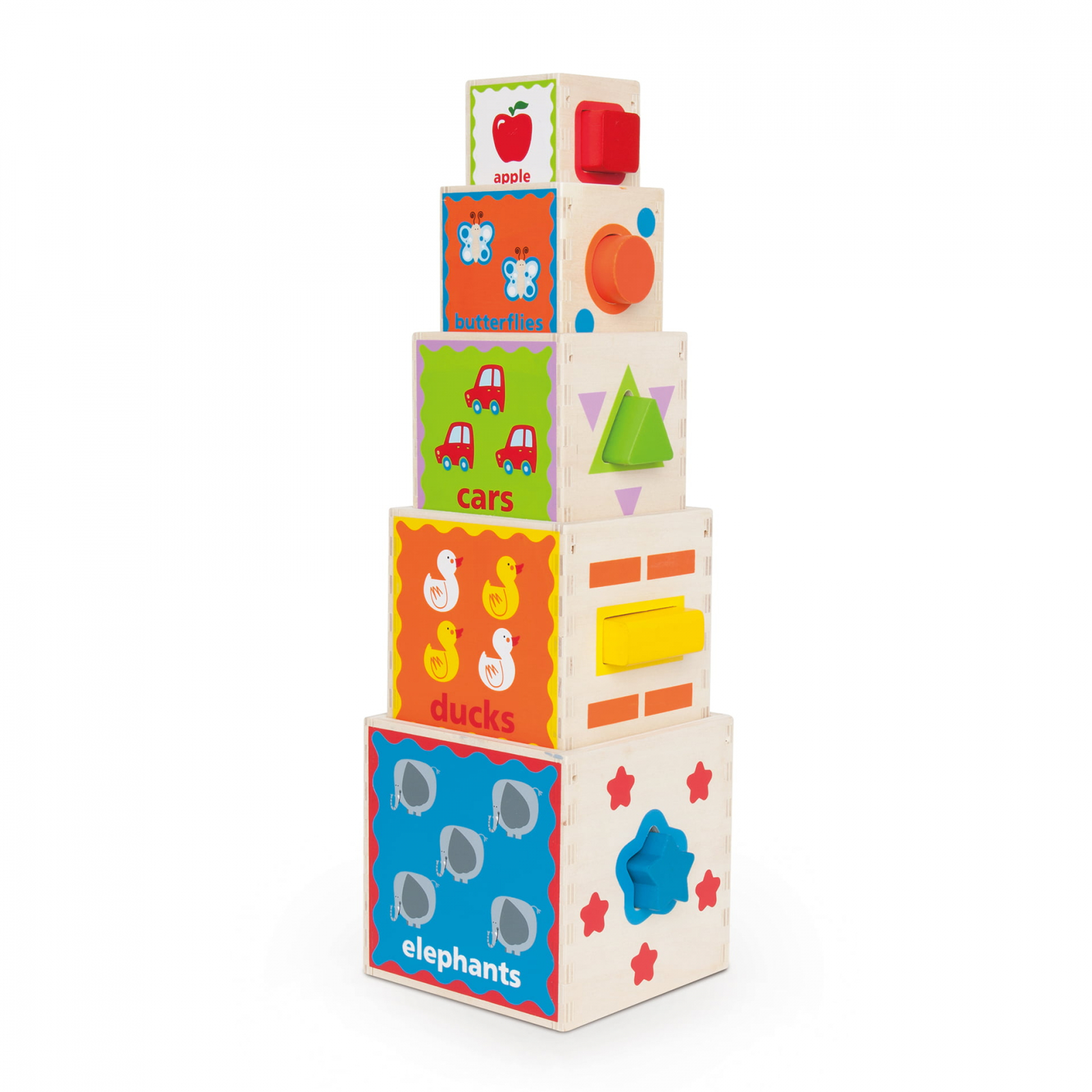 Setul de blocuri de stivuire este excelent pentru exersarea conceptelor comparative, cum ar fi mai mare/mai mic. Puteti fie sa construiti turnul, fie sa le incadrati dupa dimensiune. Blocurile colorate incurajeaza sortarea si coordonarea mana-ochi prin inserarea de forme colorate in gaurile corespunzatoare. Imaginile cu obiecte familiare ilustreaza numerele 1-5, copiii se vor bucura sa numere obiectele. Cu acest set cu litere mari si minuscule de la A la E, invatarea ABC-ului nu a fost niciodata atat de distractiva! Piramida jocului Hape incurajeaza copiii sa-si dezvolte abilitati independente de joaca sau sa lucreze impreuna cu prietenii si familia. Jucariile sunt realizate din lemn, folosind materiale ecologice, vopsite in culori atragatoare cu vopsele nontoxice, care depasesc cele mai inalte si stricte standarde internationale de siguranta si calitate, precum EN71, ISO9001, ASTM F963 si altele. Dimensiuni: L: 14, l: 14, H: 14 cm; Dimensiuni cutie: L: 25.5, l: 15, H: 24 cm.
