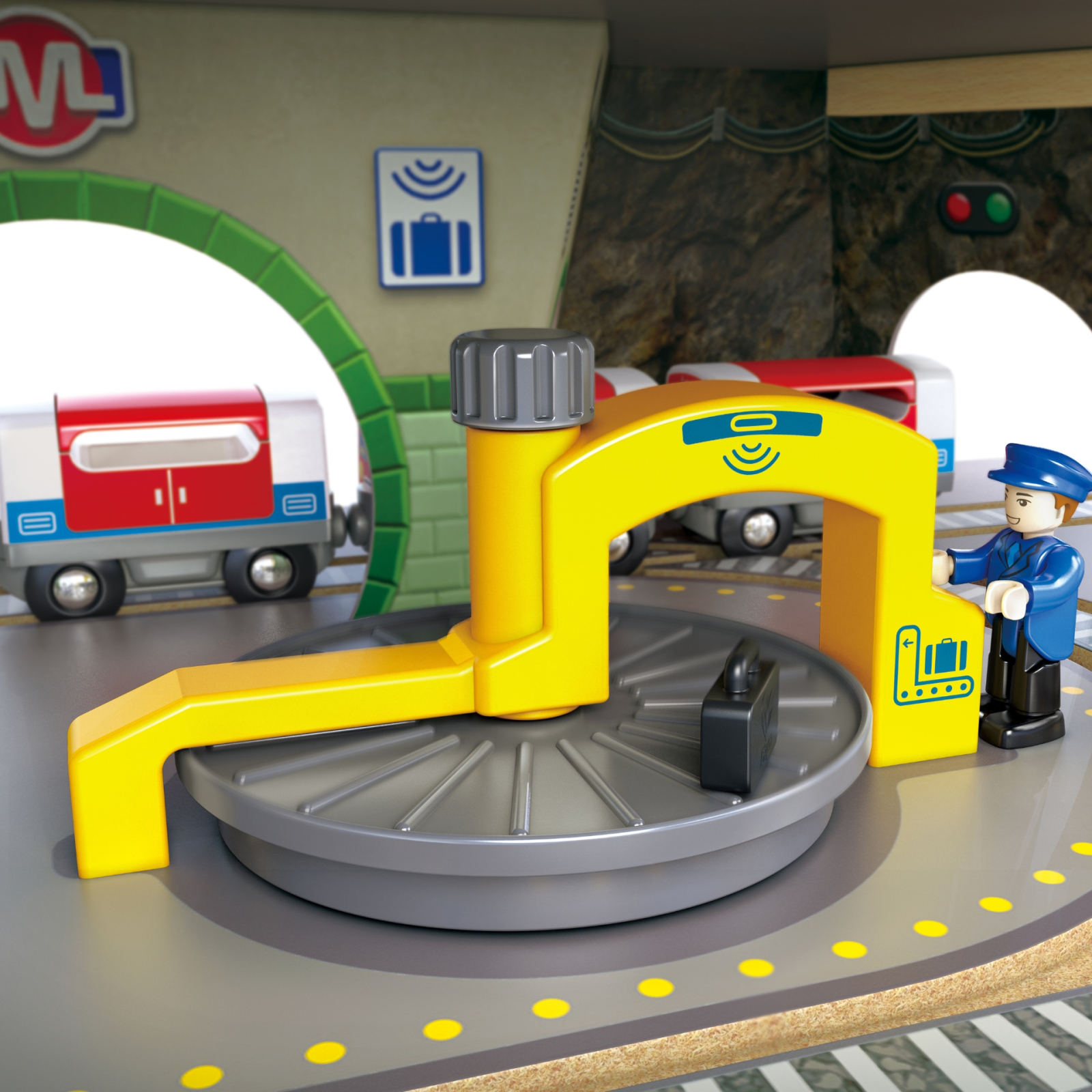 Bucura-te de joc vertical palpitant cu sina in spirala sau participa la diverse caracteristici interactive, cum ar fi caruseluri pentru bagaje, ascensoare pentru pasageri si trenuri, garaje, platforme turnante, o piata si statii de spalare si alimentare cu combustibil._x000D_