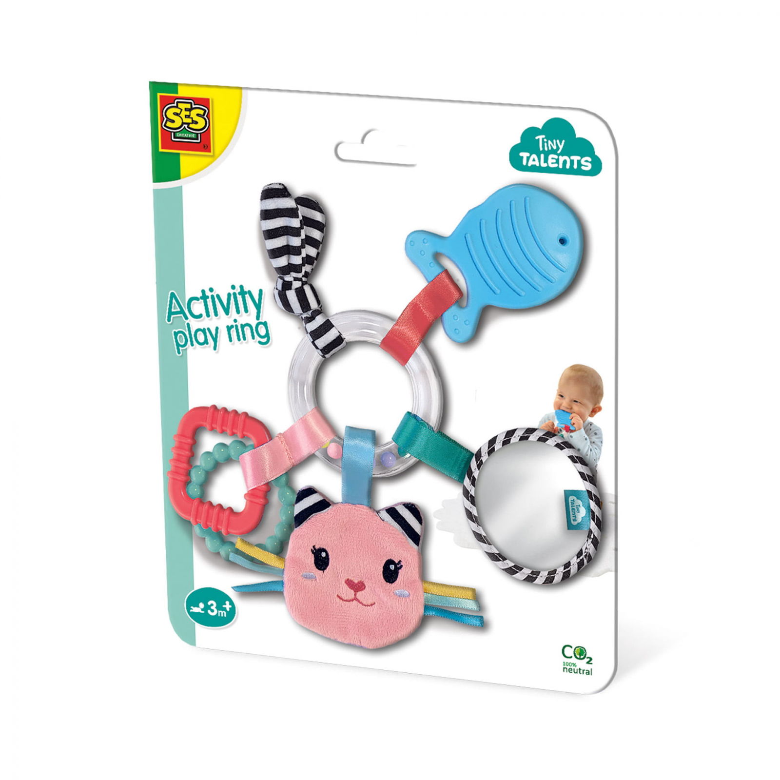 Cu acest inel de joaca practic, copiii se pot distra cu diverse activitati. Mestecati jucarii cu texturi, o pisica cu mustati agitate, o oglinda sau elemente cu contrast ridicat pentru dezvoltarea vizuala. Inelul de joc stimuleaza diferitele simturi pentru dezvoltarea copiilor. Contine: inelul cu activitati senzoriale; inel cu zornaitura; oglinda rotunda; pisica din material textil cu mustati taraitoare si agitate; peste jucarie de mestecat din cauciuc cu creste senzoriale; doua inele colorate cu texturi de strans din cauciuc; textil de contrast ridicat pentru stimulare senzoriala. Dimensiuni: 20 x 24 x 2 cm.