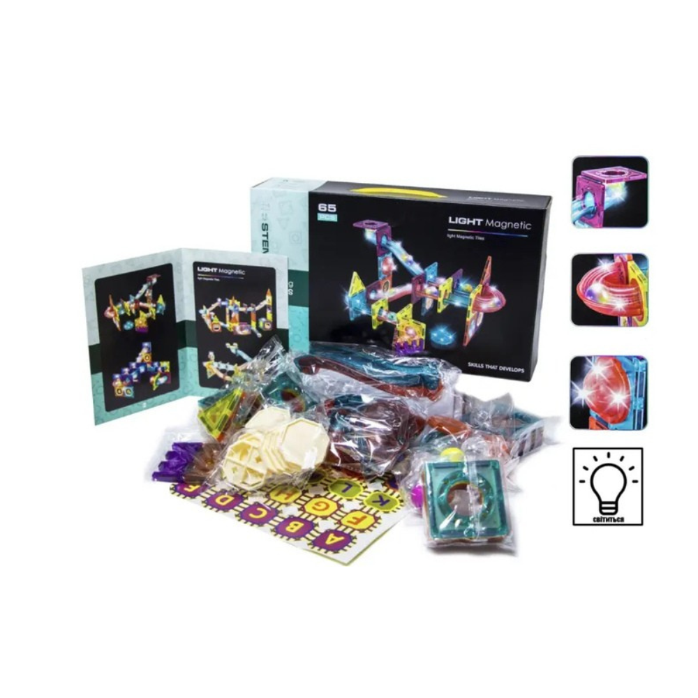 Labirintul meu magnetic cu lumini este un joc inovator si captivant care imbina distractia cu invatarea. _x000D_ Caracteristici: _x000D_ _x000D_ cu cele 65 de piese colorate si usor de manevrat, cei mici pot construi structuri uimitoare, explorand notiuni de echilibru, spatiu si forma_x000D_ datorita conectarii magnetice, piesele se imbina rapid si sigur, incurajand creativitatea si perseverenta_x000D_ acest set este ideal pentru dezvoltarea abilitatilor cognitive si motorii fine, oferind in acelasi timp ore intregi de joaca educativa_x000D_ un instrument excelent pentru acasa, gradinita sau afterschool, care stimuleaza cooperarea si invatarea prin joc_x000D_ include elemente cu lumini, pentru un plus de atractivitate si joaca interactiva_x000D_ fabricat din plastic durabil cu magnet integrat_x000D_ potrivit pentru constructii 3D_x000D_ culori atractive si design robust_x000D_ _x000D_ Elemente luminoase incluse:_x000D_ _x000D_ accesoriu luminos semirotund: 2 bucati care functioneaza cu 3 baterii LR1130 (incluse)_x000D_ accesoriu luminos octogonal: 1 bucata care functioneaza cu 3 baterii LR41 (incluse)_x000D_ bila luminoasa: 4 bucati, fiecare functioneaza cu 1 baterie LR1220 (inclusa), nu se poate inlocui_x000D_ _x000D_ Dimensiuni ambalaj: 36.5 x 7.5 x 21.5 cmDimensiune piesa: 7.5 cm_x000D_ Varsta recomandata: 3 ani+ _x000D_ Atentie! Contine magneti. Inghitirea/inhalarea poate provoca accidente grave sau fatale. Consultati urgent medicul. Pericol de sufocare: Contine piese mici. Nerecomandat sub 3 ani. Indepartati ambalajele inainte de utilizare. Supravegheati copilul in timpul utilizarii. Pastrati instructiunile. Feriti de foc, caldura si umiditate. Produsul poate diferi de fotografie, specificatii sau ilustratii._x000D_