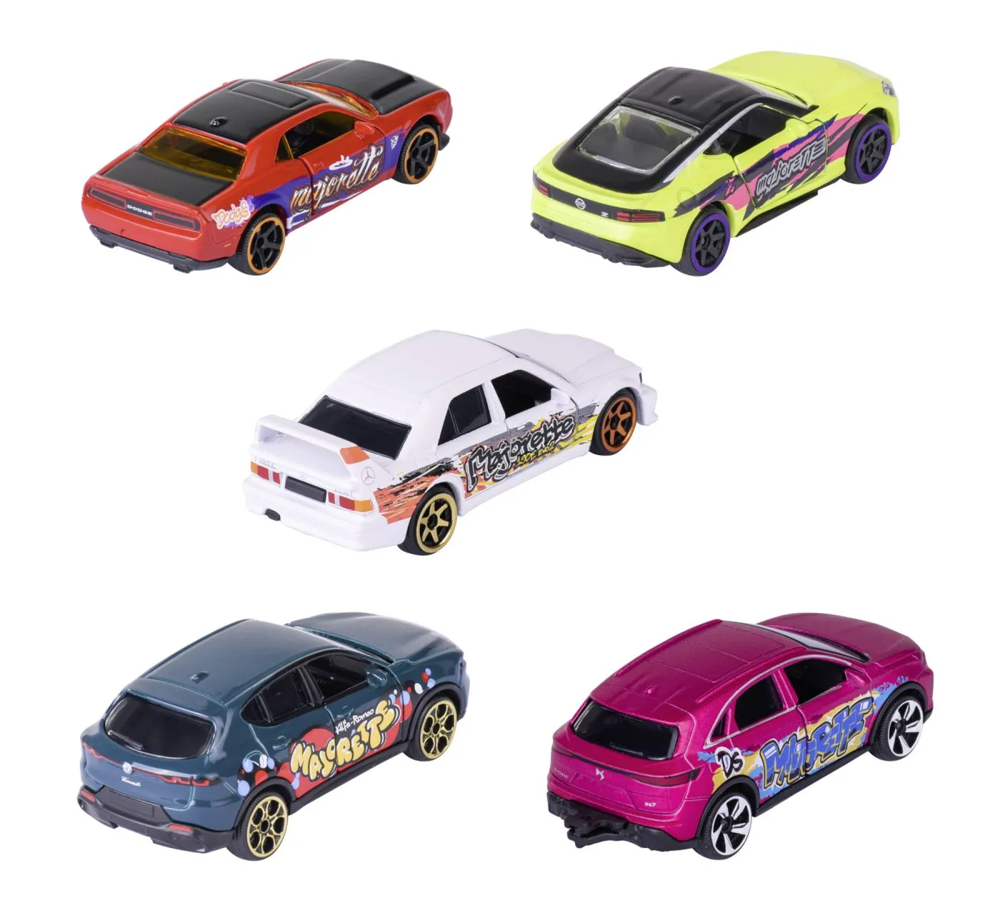 Set de masini Majorette Editie limitata 11 in aspect graffiti (5 masini) - 5 masini model metalic cu roata libera, suspensie si portiune de deschidere, masini de jucarie pentru colectionari si copii de la 3 ani si peste, 7,5 cm fiecare. Puterea se intalneste cu stilul - urban, atragator si inconfundabil acest set de masini Majorette combina 5 vehicule clasice cu licenta intr-un design graffiti individual - cu culori stralucitoare si etichete cool! Setul cadou contine 3 modele premium ale Editiei limitate 11 (Dodge Challenger SRT Demon, Mercedes-Benz 190E 2.5-16 Evo II si Alfa Romeo Tonale) precum si 2 masini speciale, ce pot fi gasite doar in acest set Nissan Z in galben neon si DS7 E-Tense in roz - desigur si cu graffiti!