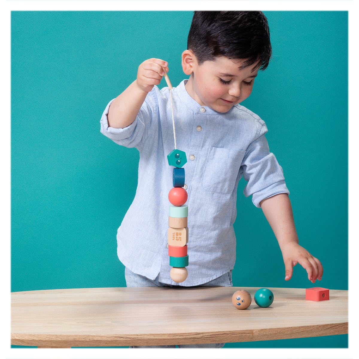 - Setul include 12 margele mari, colorate din lemn, unele dintre ele imprimate cu fete amuzante, si un snur rezistent cu capete din lemn, usor de manevrat de mainile mici.