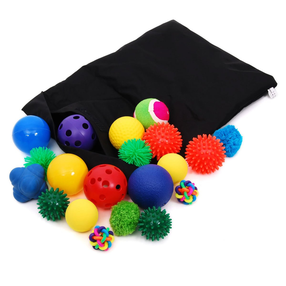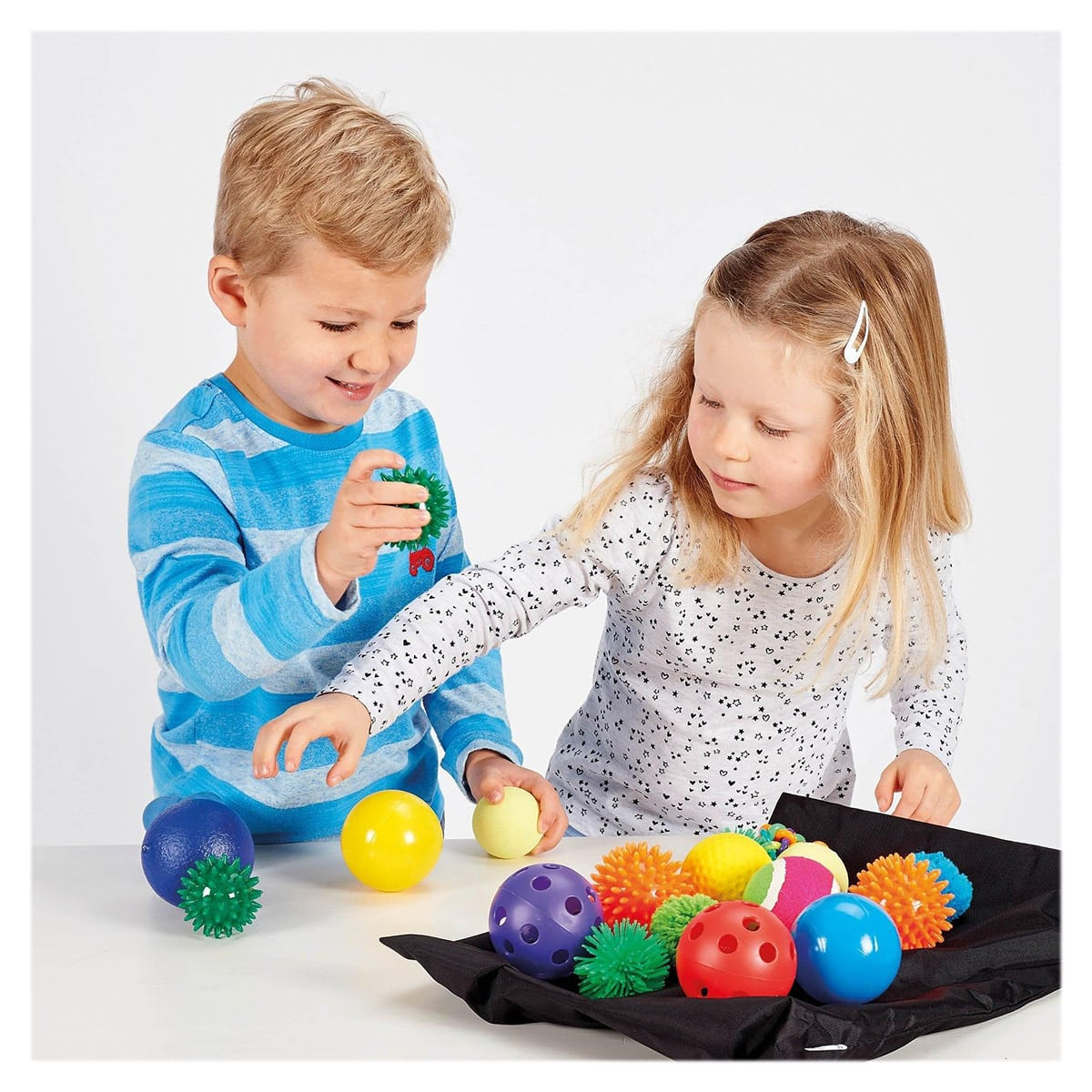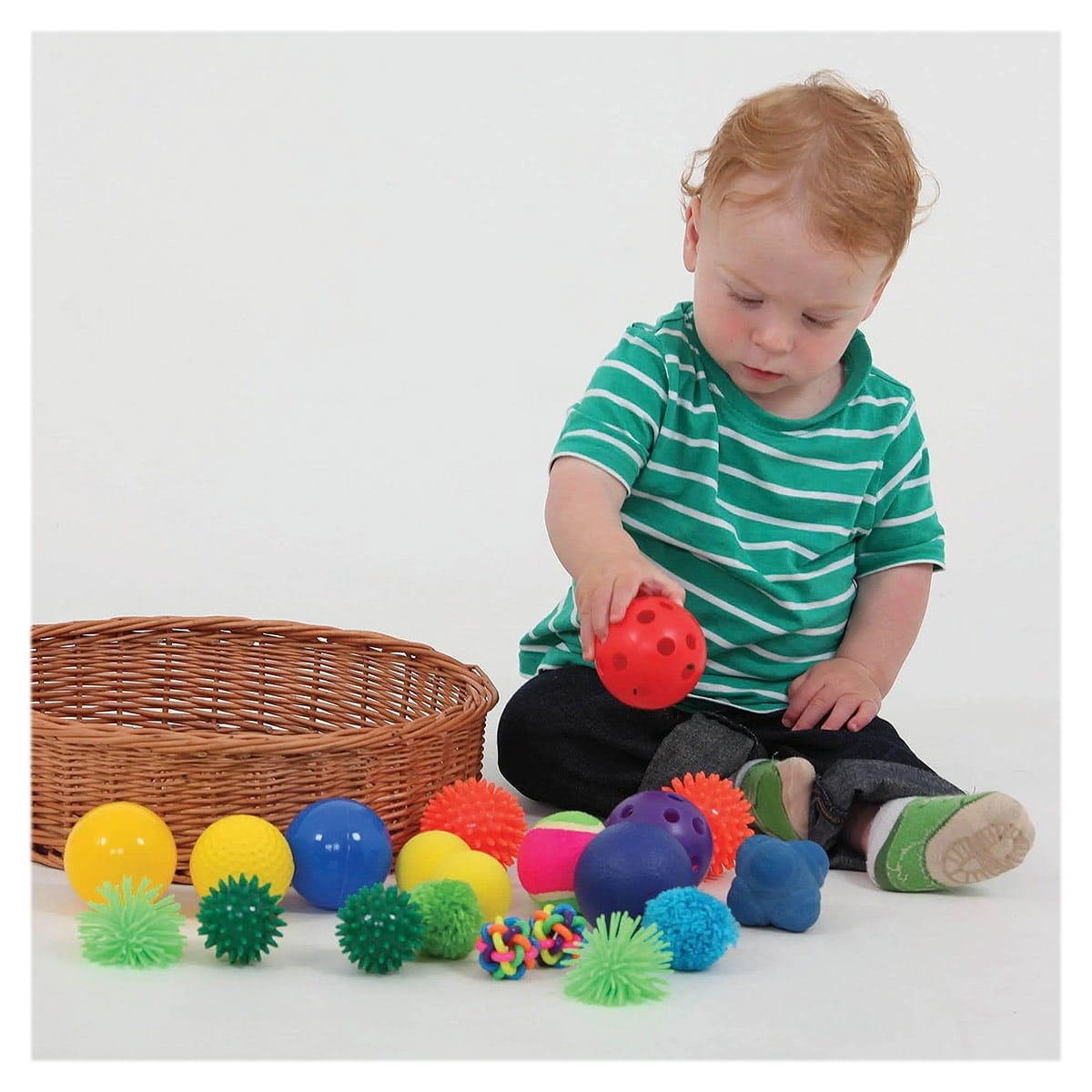 • Acest set versatil cu 20 de mingi senzoriale cu texturi, culori, forme si densitati diferite este ideal pentru a incuraja explorarea senzoriala a copiilor.