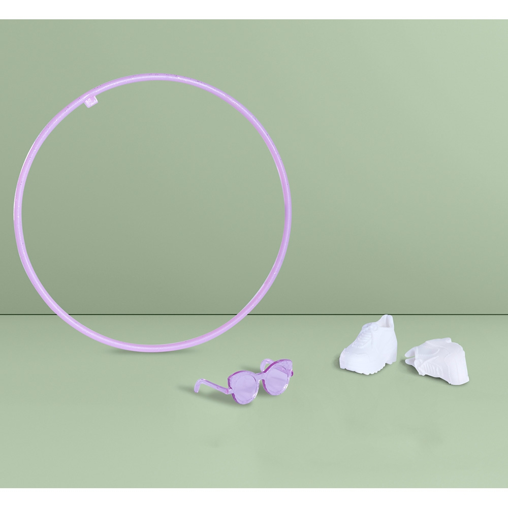 Cercul hula hoop se poate atasa usor de solduri, trebuie doar ridicate mainile papusii si fixat cercul