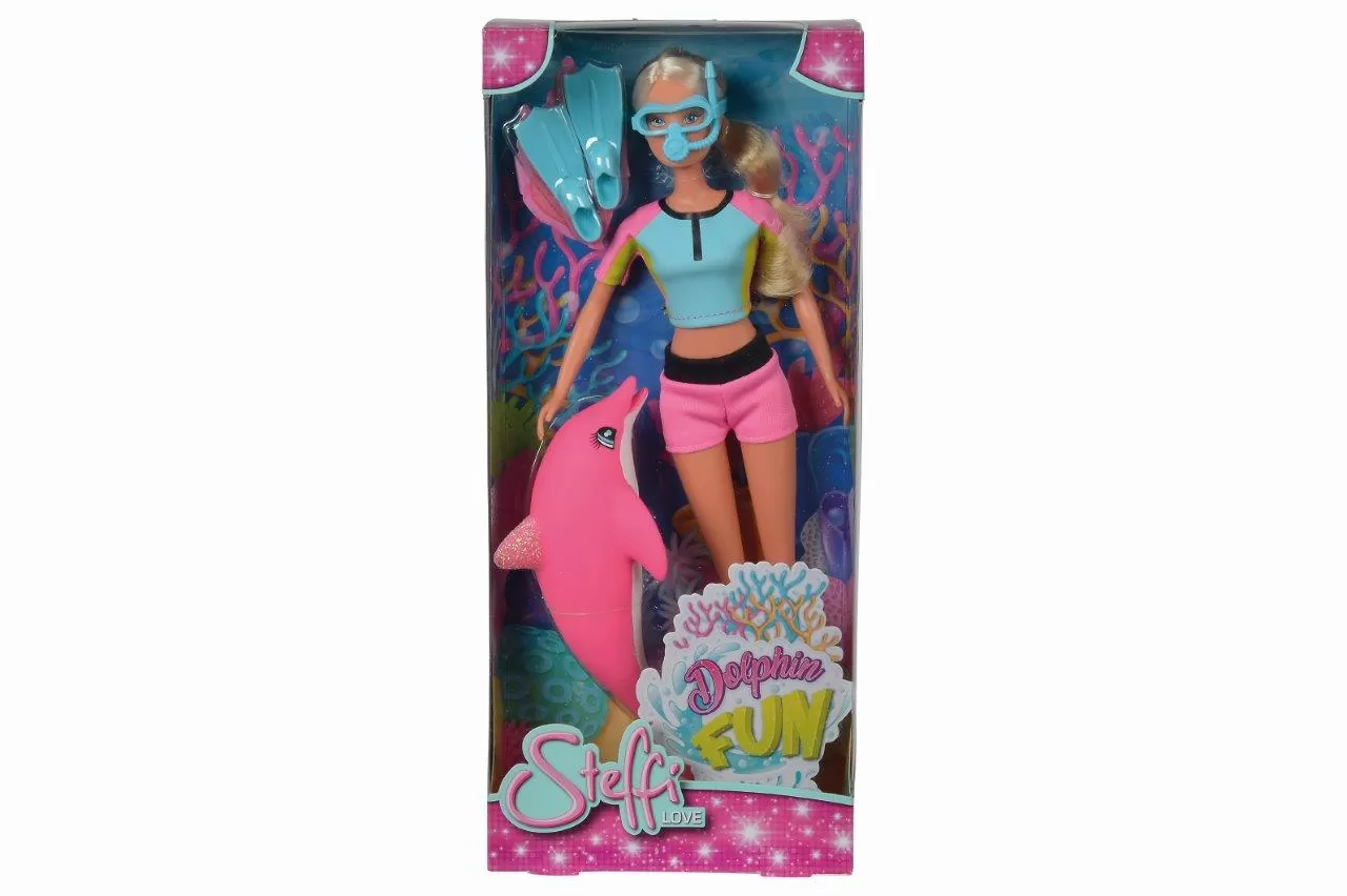 Steffi exploreaza lumea subacvatica intr-o tinuta scurta de scufundare din doua piese, cu aripioare si ochelari albastri.Papusa lui Steffi pluteste un delfin roz dragut al carui inotatoare din spate straluceste frumos.