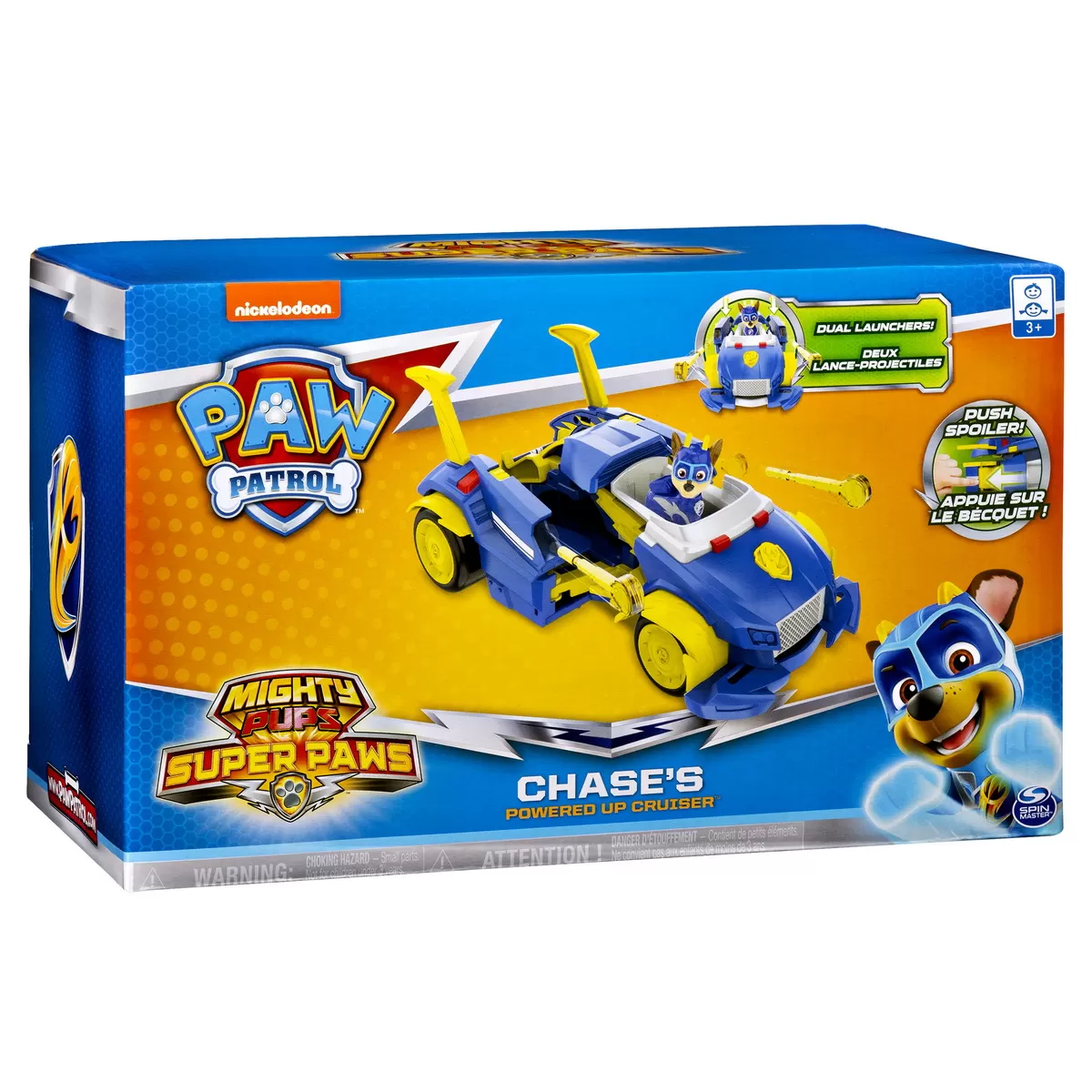 Gaz la maxim! Super-vehicule ale Patrulei Catelusilor sunt gata pentru actiune! Alaturati-va lui Chase si traiti aventuri cu vehicule super rapide, pline de surprize, care pot suferi o transformare extraordinara. Cand se apropie pericolul, treceti la modul special. Pur si simplu apasati spoilerele si partile laterale ale masinii se vor deschide, dezvaluind mecanisme transparente si aruncatoare de grenade. Chase si super-vehiculul lui sunt gata pentru orice, chiar si pentru a elimina obstacolele cu grenadele aruncate de masini. Iar cand pericolul dispare, pur si simplu apasa mecanismul pentru a reveni la aspectul obisnuit al masinii dvs. Setul include 1 figurina Mighty Pups Super PAWs, 1 Super-vehicul, 2 aruncatoare de grenade si un manual de utilizare. Îmbracate in uniformele lor, figurinele catelusilor curajosi sunt gata sa se urce la volanul masinilor lor.