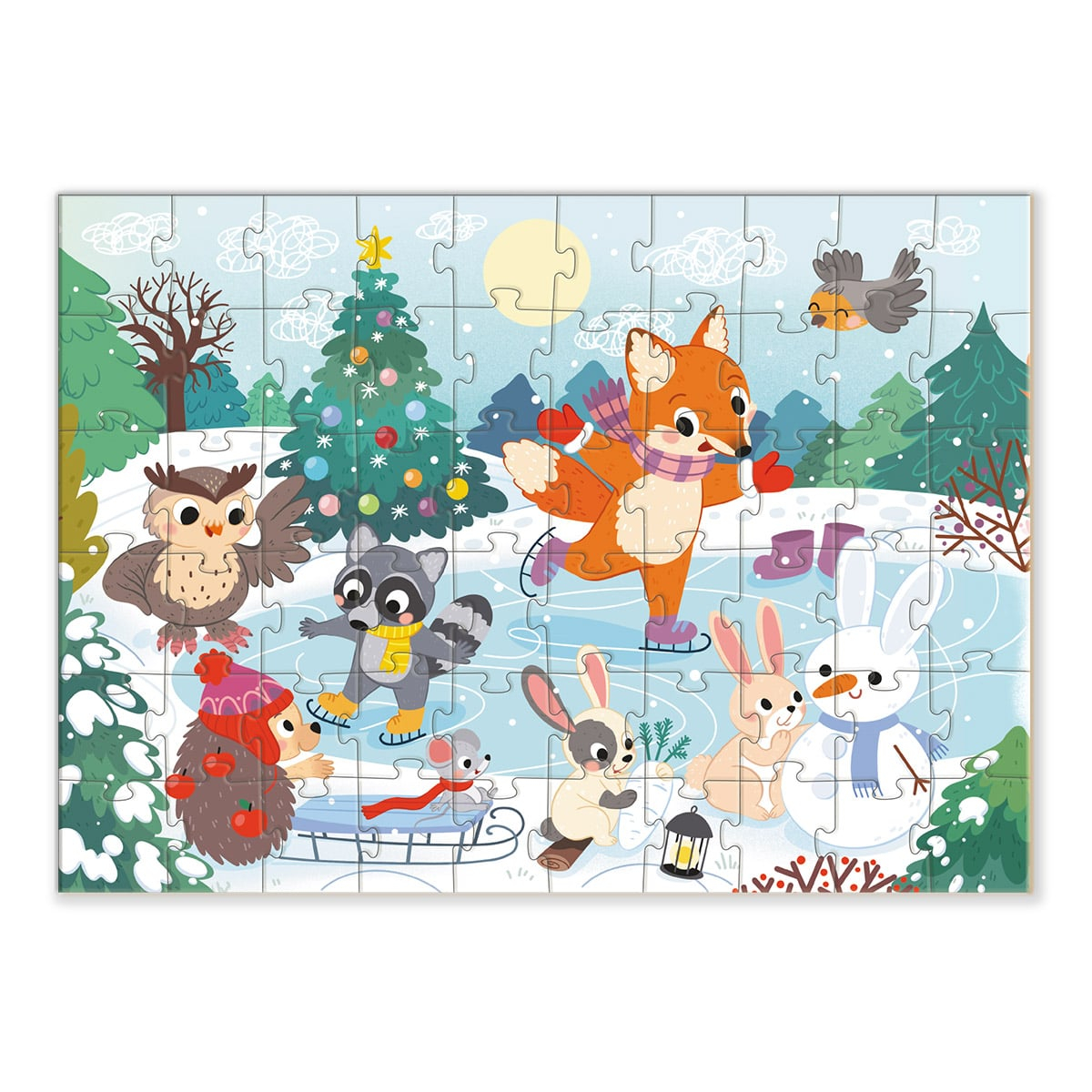 Asambleaza corect cele 60 de piese ale acestui puzzle minunat in culori vibrante si insoteste-le pe animalutele vesele iarna, la patinoarul din padure!