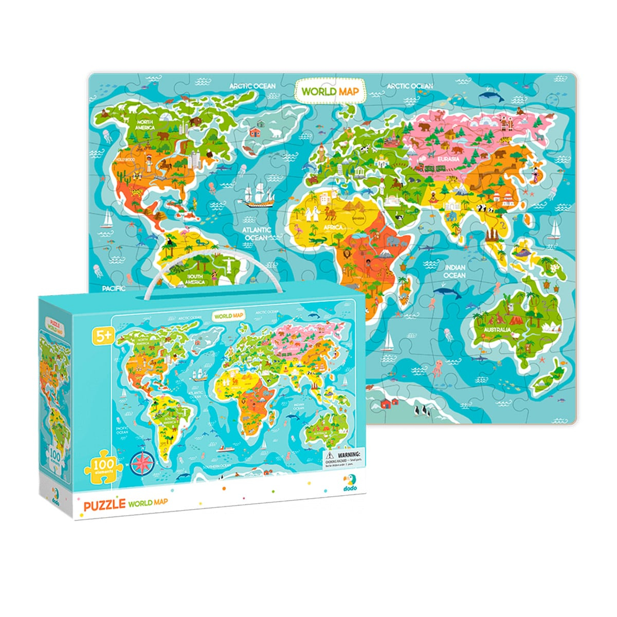 • Exploreaza planeta noastra si studiaza continentele, animalele, obiectivele turistice si multe alte lucruri interesante cu puzzle-ul Harta lumii, 100 piese de la Dodo Toys!