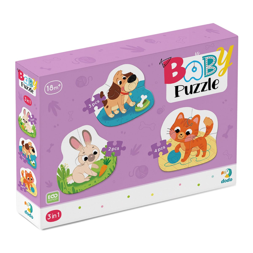 • Acest puzzle dragut 3 in 1 de la Dodo, Animale de companie ofera o joaca captivanta si educativa pentru copiii mici cu varsta intre 18 luni si 3 ani.