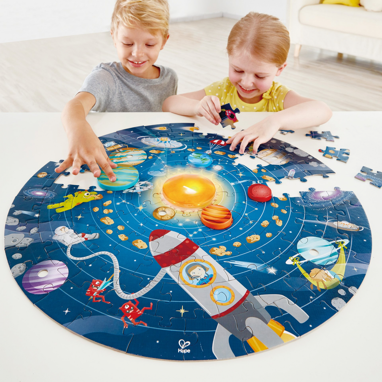 Hape Puzzle Sistemul Solar pentru copii, cu led si planete din lemn (102 piese), copii varsta 5 ani+,8 ani+