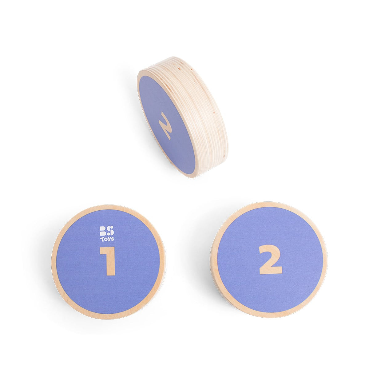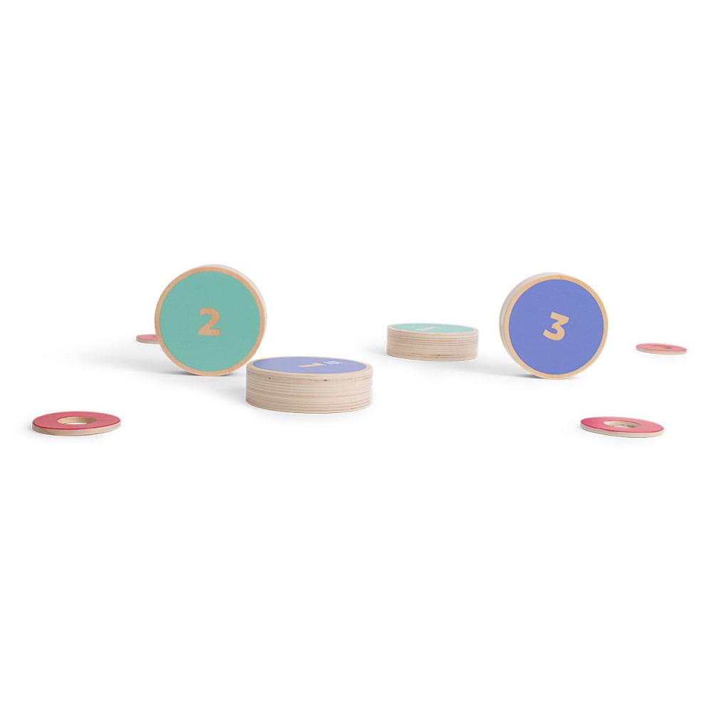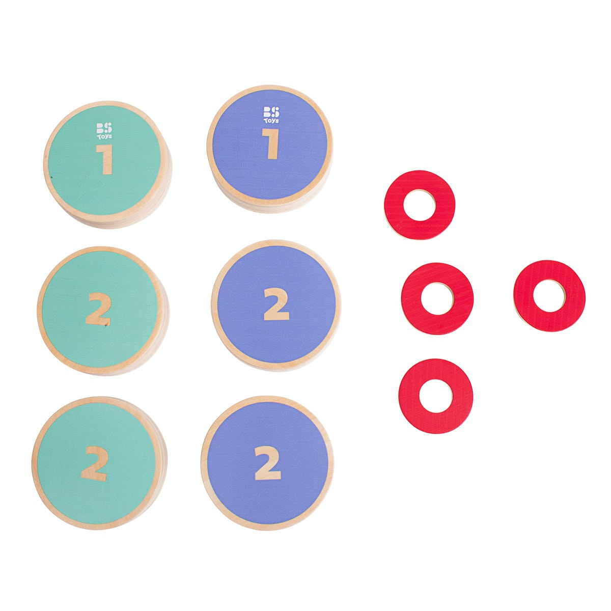• Continut: 6 discuri din lemn(2 seturi) cu diametrul de 12 cm, 4 jetoane marcatoare rosii din lemn cu diametrul de 7 cm.