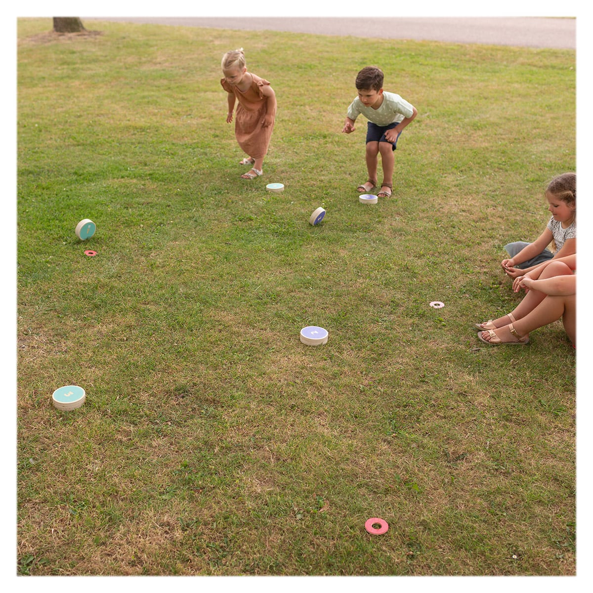 • Plaseaza jetoanele de marcaj, arunca discurile in asa fel incat sa se opreasca cat mai aproape de zonele marcate pentru a castiga puncte!