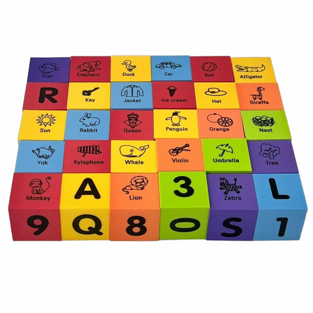 Acest set de 30 cuburi educationale din spuma colorata este conceput pentru dezvoltarea cognitiva si motrica a copiilor. Fiecare cub este imprimat cu litere, cifre sau animale, oferind stimulare vizuala si suport pentru invatarea alfabetului, numerelor si vocabularului.