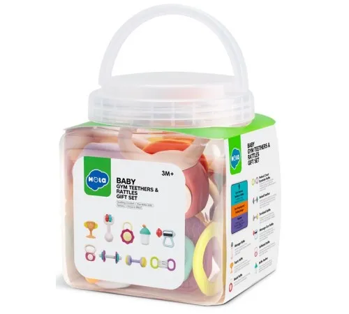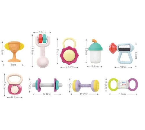 Set 9 jucarii gingivale in forma de echipamente cu tematica de sala. Acest adorabil set de zornaituri stimuleaza abilitatile motorii fine, descoperirea senzoriala si ii ajuta pe copii sa inteleaga cauza si efectul. Este usor de tinut in mana si de manevrat. Usor de dezinfectat. Creste-ti copilul pentru a deveni un pasionat de sport. Jucariile de dentitie ajuta la calmarea disconfortului gingival, zornaitoarele ajuta la stimularea simturilor si la antrenarea abilitatilor motorii.