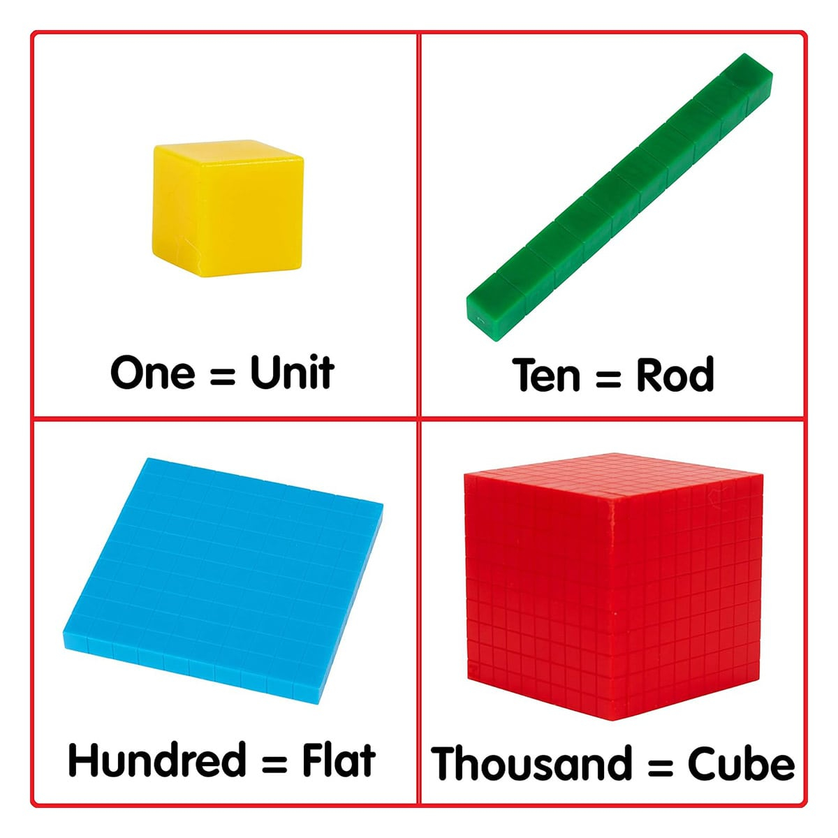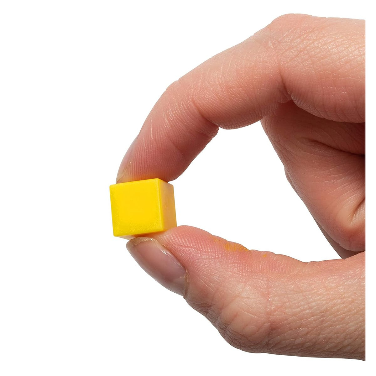 - Setul contine 131 de piese realizate din plastic reciclat: 100 de unitati interconectabile galbene (1x1x1 cm), 20 de bare verzi (10x1x1 cm), 10 placi albastre (10x10x1 cm), 1 cub rosu de o mie (10x10x10 cm).