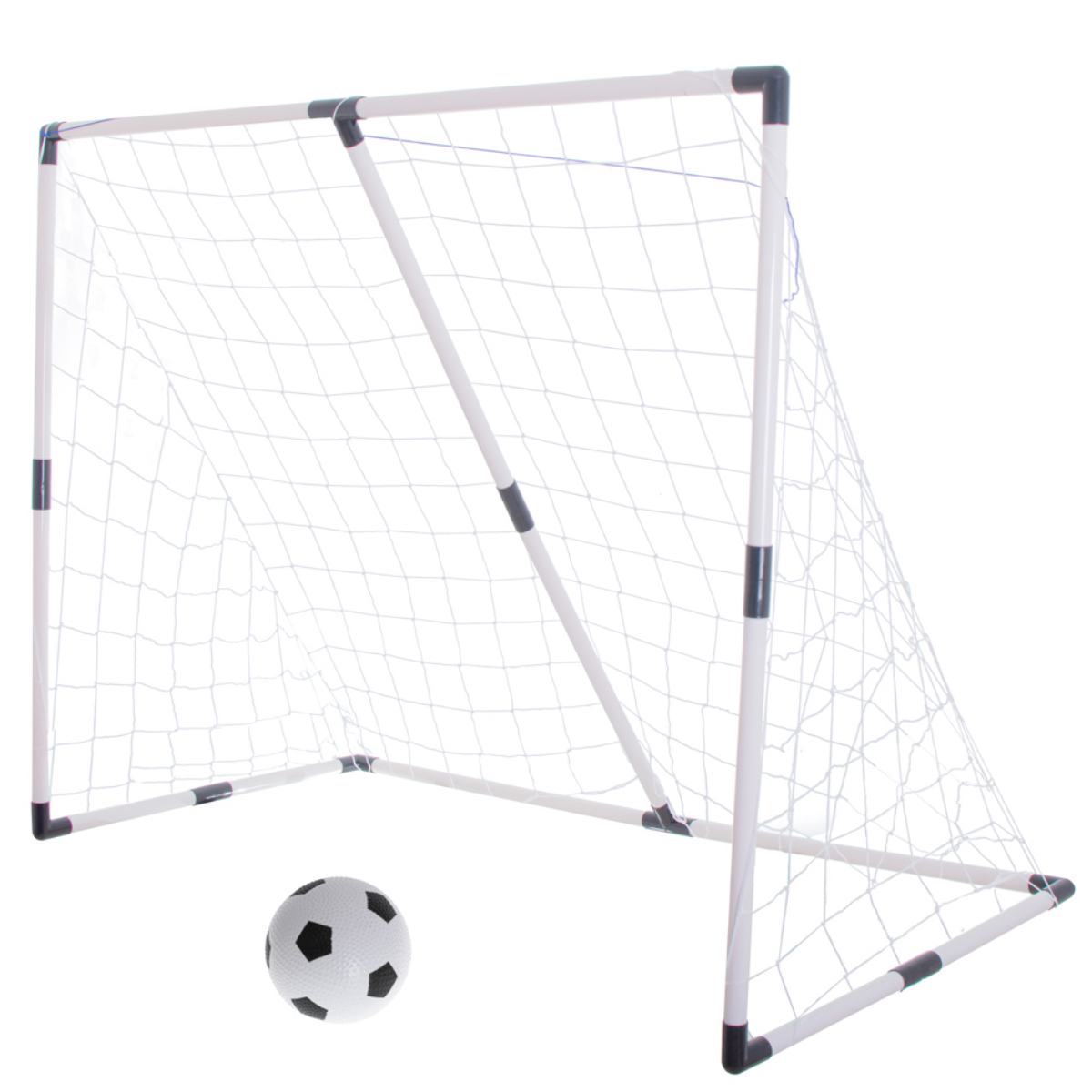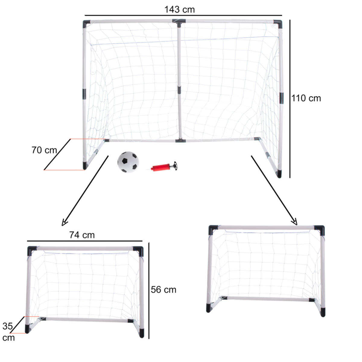 Acest set de fotbal versatil pentru copii de peste 3 ani permite configurarea a doua porti mici (74 x 56 x 35 cm) pentru meciuri in echipa sau a unei porti mari (143 x 110 x 70 cm) pentru antrenamentul preciziei. Pachetul complet include elementele de constructie din plastic rezistent si cauciuc, doua plase mici, o plasa mare, o minge de 14 cm si o pompa manuala. Designul modular ofera o solutie practica pentru dezvoltarea coordonarii motrice, a spiritului de echipa si a concentrarii, fiind ideal pentru utilizarea in curte sau gradina. Asamblarea este simpla, rapida si nu necesita unelte suplimentare, transformand orice spatiu exterior intr-un teren de antrenament profesional pentru micii sportivi.