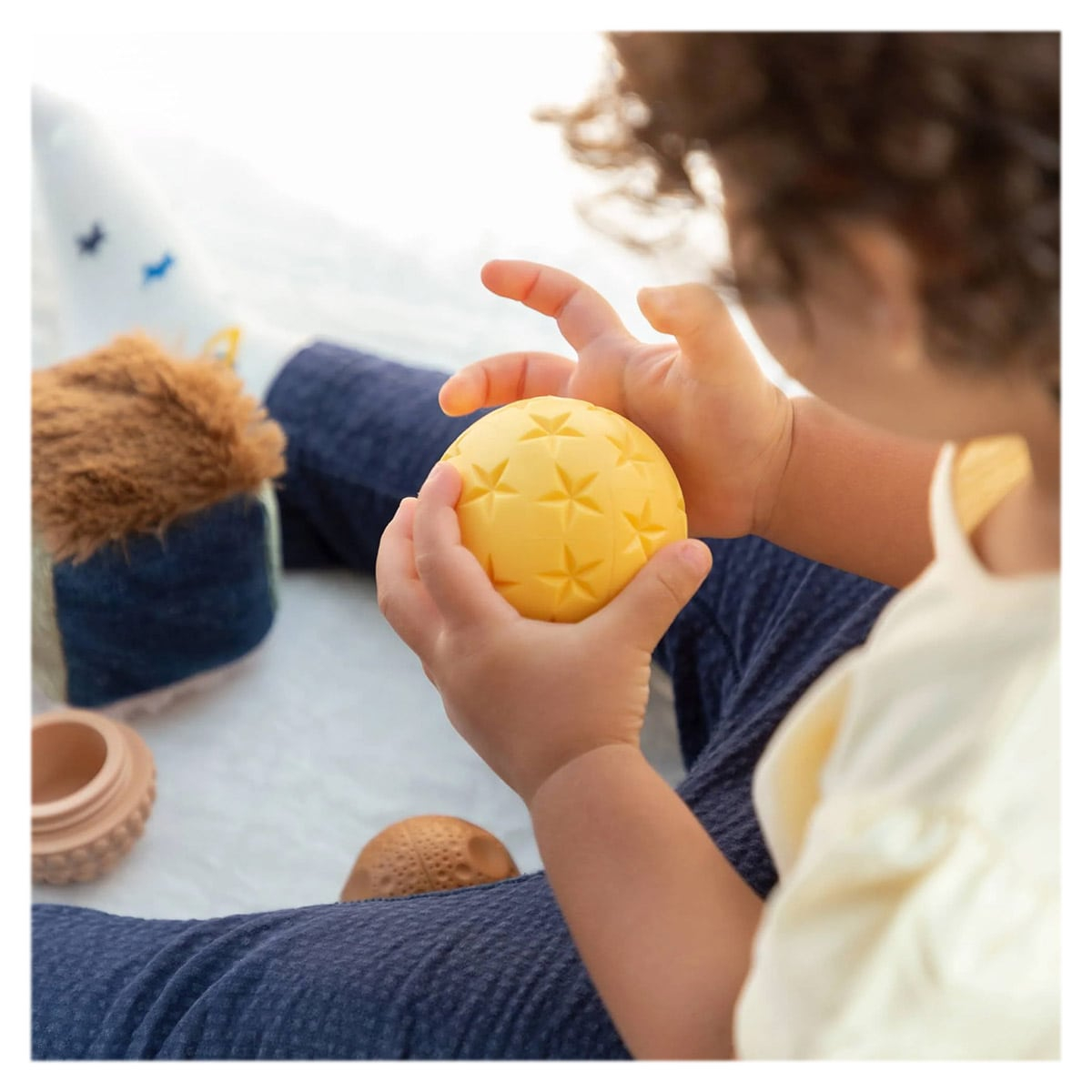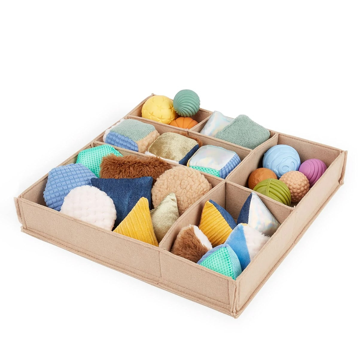 • Setul contine 27 de piese: forme din materiale textile diferite si bile cu suprafata texturata din plastic moale. Continutul si culorile pieselor pot varia