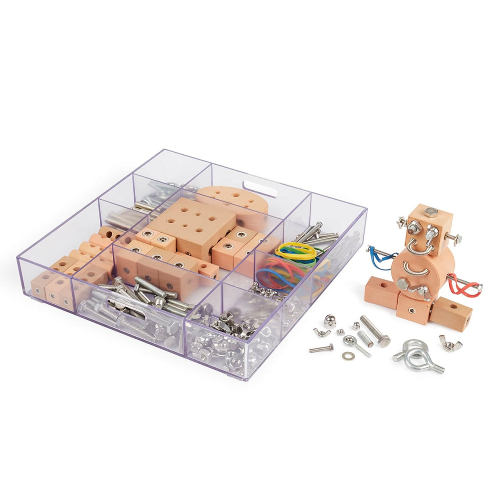 • Setul ii incurajeaza pe copii sa exploreze, sa construiasca si sa demonteze si include un sortiment de diverse materiale de constructie autentice, cum ar fi blocuri Poly+, benzi de cauciuc, piulite, suruburi si accesorii, pentru a crea personaje inspirate de roboti, barci, turnuri si nenumarate creatii imaginative.