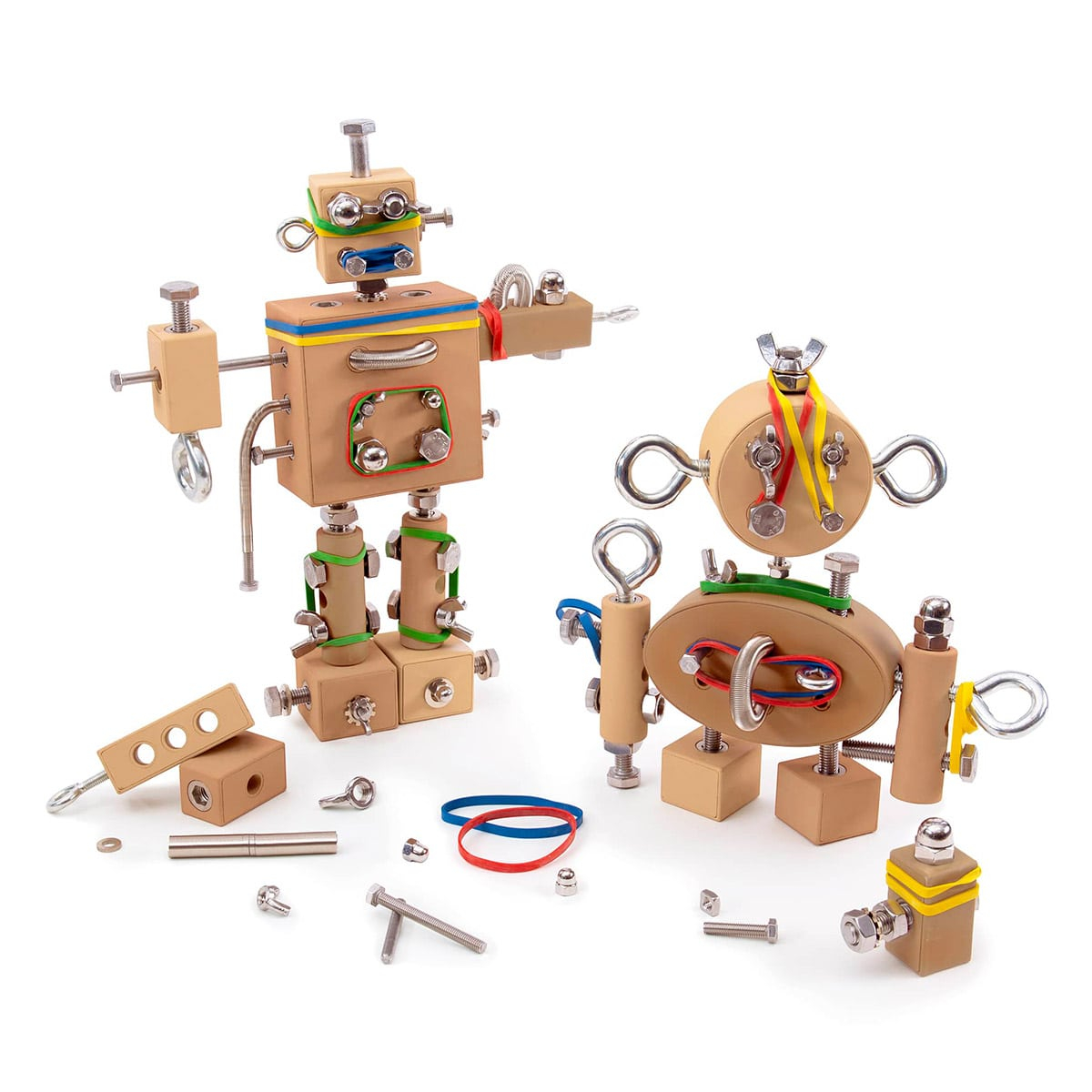 • Setul include o varietate de materiale de constructie autentice si accesorii: piulite si suruburi, benzi de cauciuc, blocuri fabricate din Poly+ durabil.