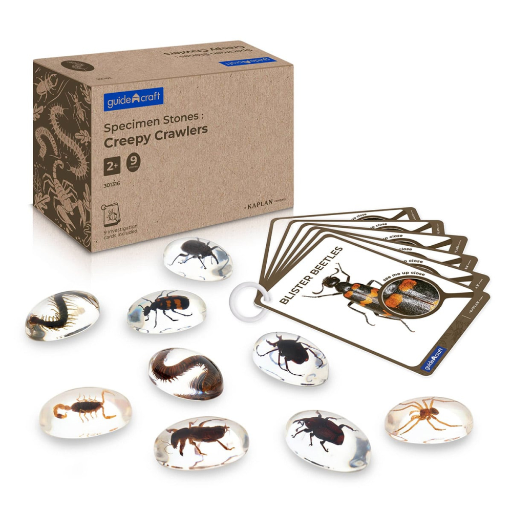 • Pietrele acrilice Specimen Stones Creepy Crawlers de la Guidecraft pot completa cu succes orice experienta de invatare stiintifica, mai ales atunci cand sunt insotite de lupe, panouri luminoase si enciclopedii sau imagini ale exemplarelor in habitatul lor natural.