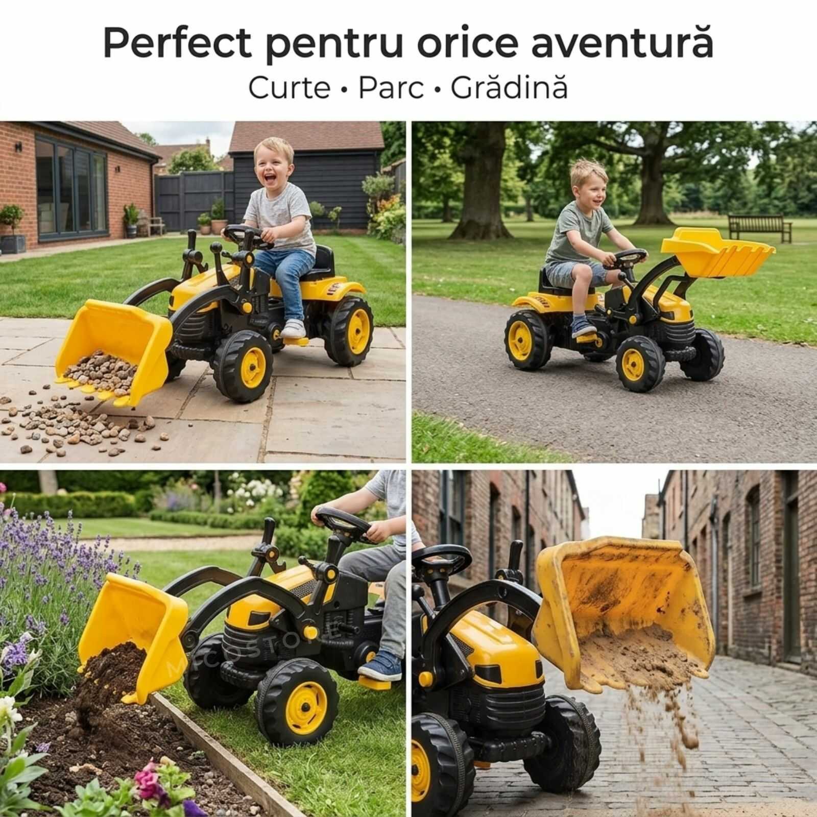 Tractorul cu pedale pentru copii este jucaria perfecta pentru micutii pasionati de utilaje de constructie.