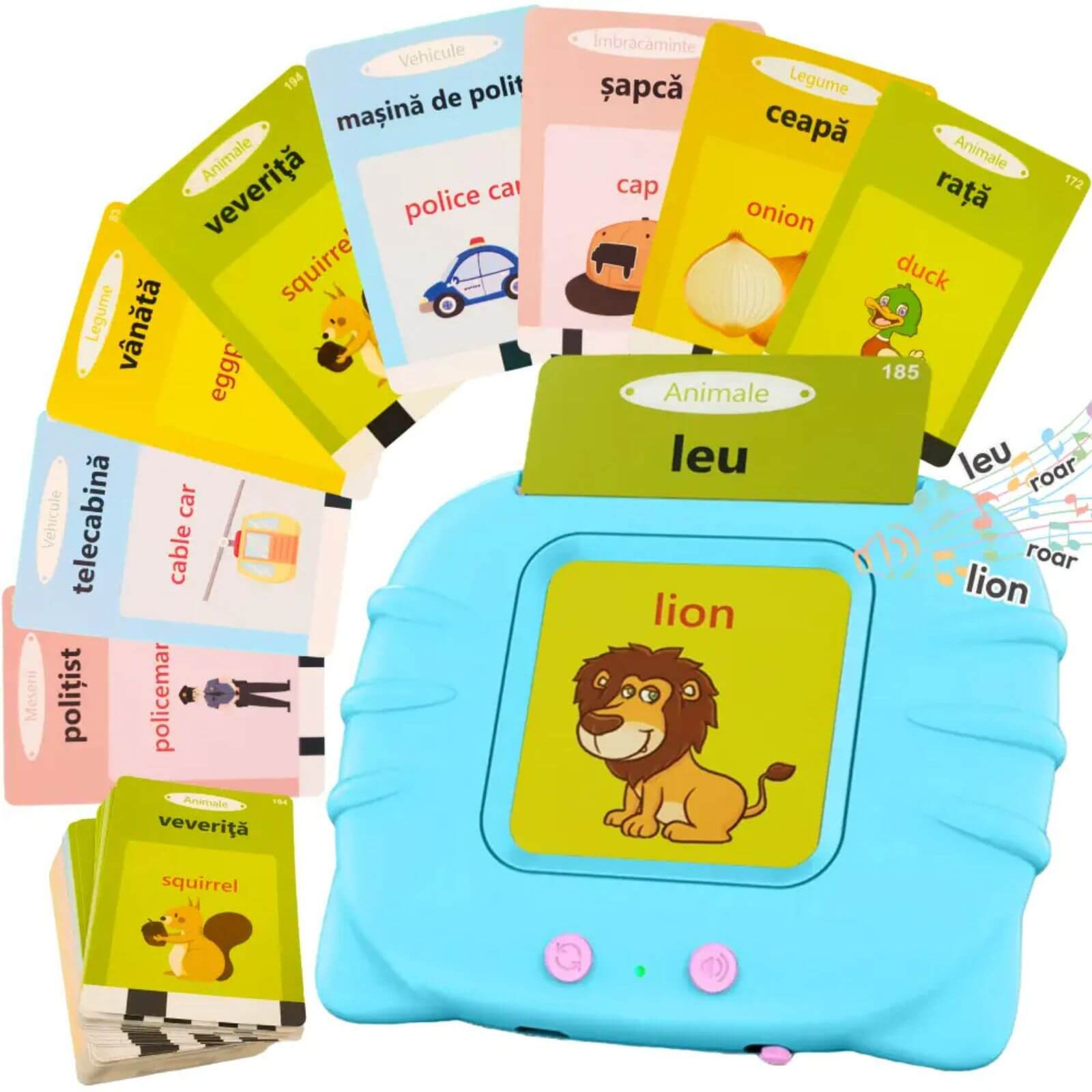 Aceasta jucarie cititor de carduri pentru copii este una dintre cele mai eficiente solutii de educatie timpurie, conceputa special pentru a sprijini dezvoltarea limbajului, invatarea cuvintelor si imbogatirea vocabularului inca de la cele mai fragede varste. Este un joc usor de folosit, care include un cititor de carduri ce reda fiecare cuvant inscriptionat pe card, folosind o voce clara, cu volum reglabil. Prin combinatia dintre carduri educative ilustrate, sunete clare, denumiri in limba romana si engleza si o interactiune intuitiva, jucaria devine rapid un instrument esential pentru parintii care cauta jucarii educative moderne, eficiente si sigure.