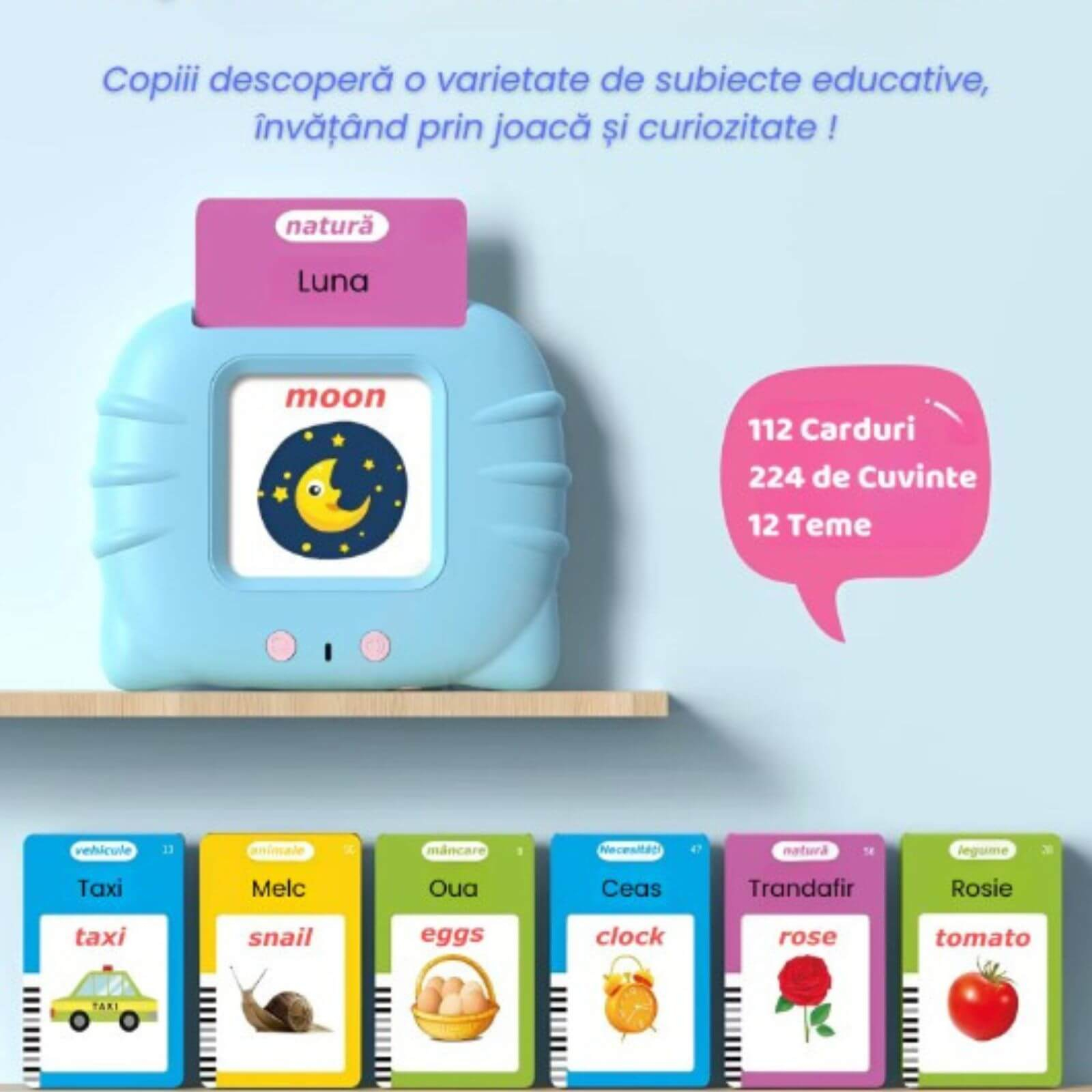 Jucarie cititor de carduri copii, educativa, bilingva, romana si engleza - invatare prin joaca, 112 carduri imprimate fata-verso, 448 de cuvinte (224 cuvinte in limba romana si 224 cuvinte in limba engleza), culoare albastru.