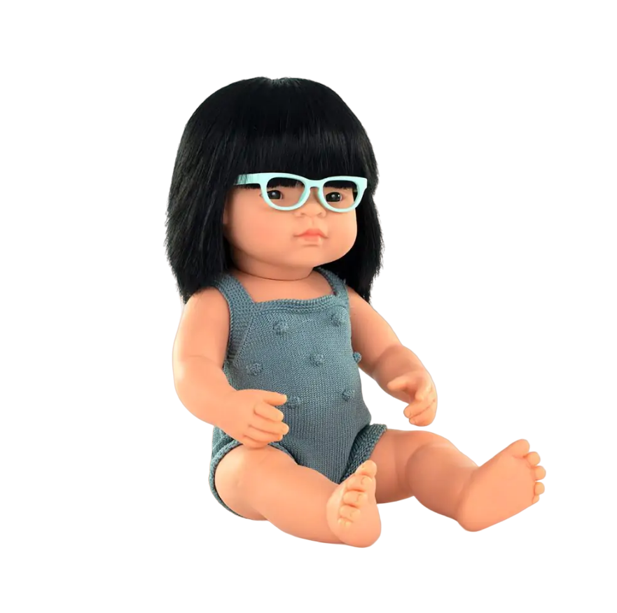 Papusa 38 cm, fetita asiatica purtatoare de ochelari, imbracata in salopeta tricotata
