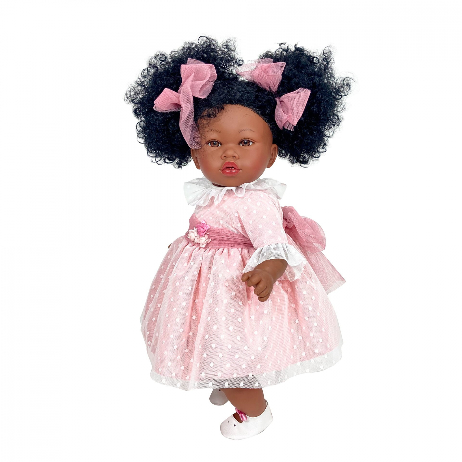 Papusa Nines D'Onil, Addis Afro, cu rochie roz plumeti, cu miros de vanilie, 45 cm.