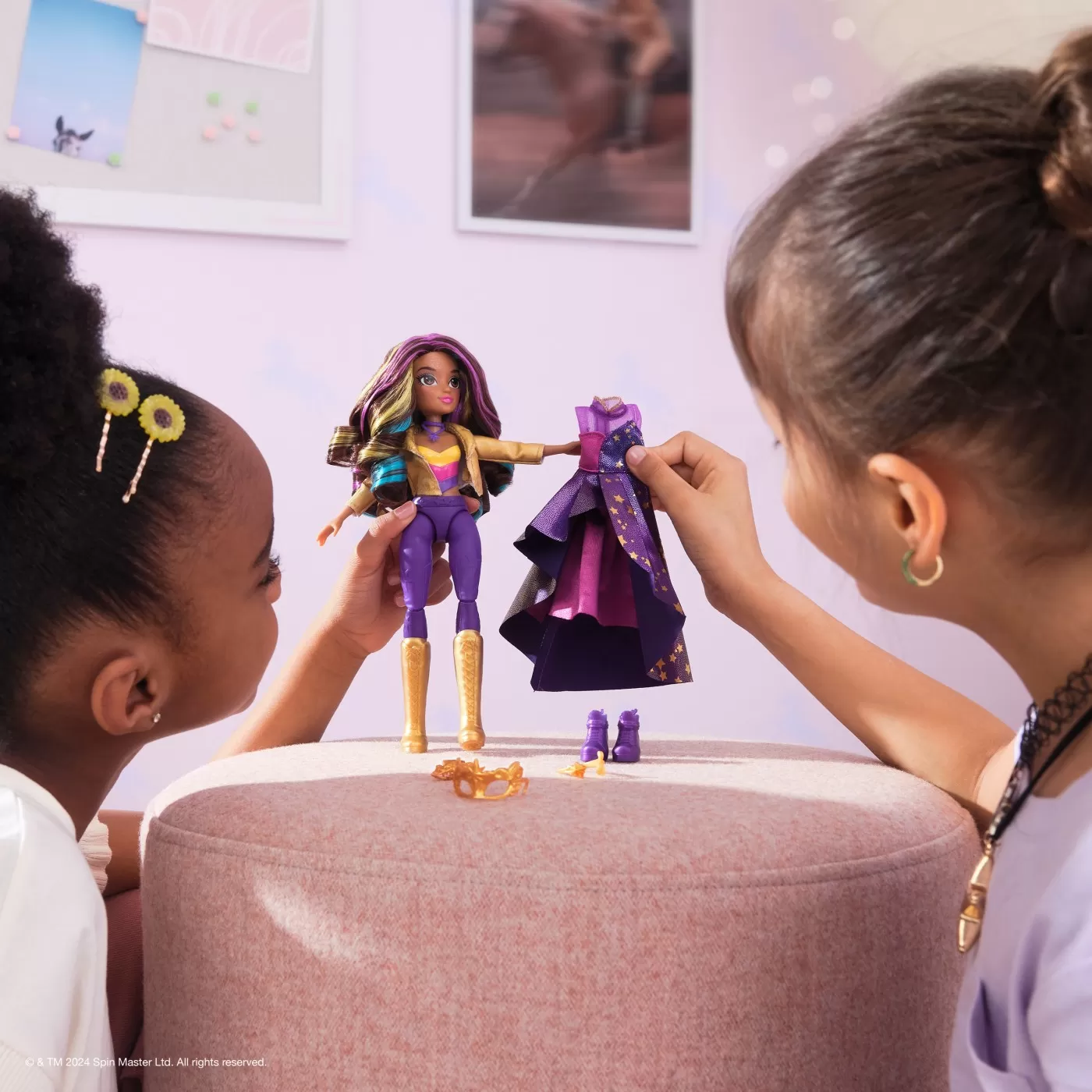 Cu detalii autentice si 9 accesorii pentru papusi, Sophia vine in echipamentul ei de calarie, gata sa calareasca spre aventura cu unicornul ei, Wildstar Lumina de Curcubeu (vandut separat).