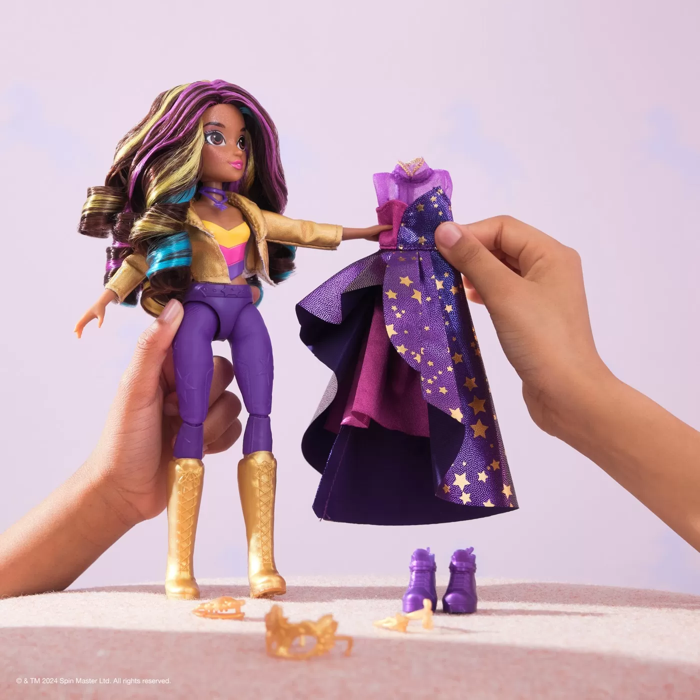 Cand vine timpul pentru bal, schimbati-o pe Sophia din jacheta detasabila, colierul si cizmele ei cu rochia asimetrica cu imprimeu cu stele, centura, masca si botinele mov.