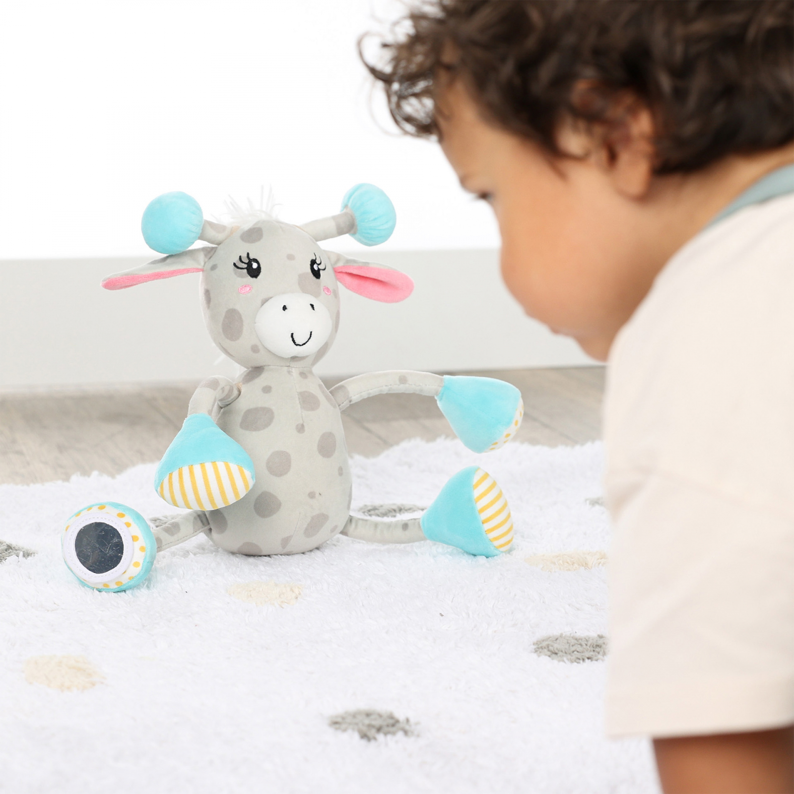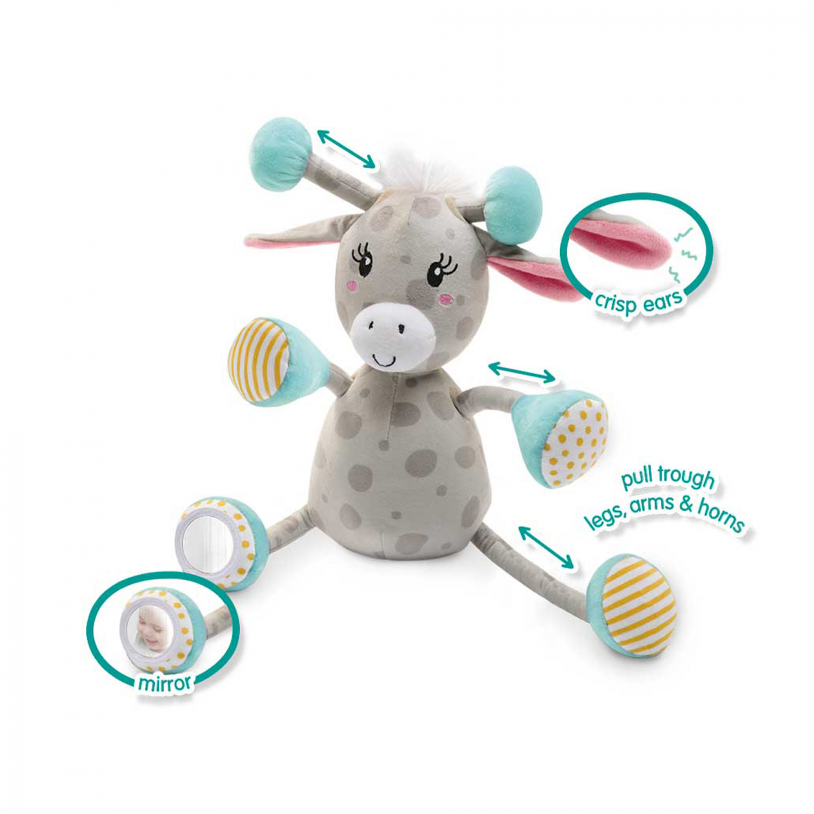 Faceti cunostinta cu Sally, aceasta girafa draguta moale are urechi, brate si picioare foarte speciale. Cand trageti de piciorul ei stang, de exemplu, bratul ei drept devine mai scurt. Sally girafa senzoriala are mai multe secrete. Urechile ii trosnesc si are o oglinda mica pe picior. Sally este potrivit pentru copiii cu varsta de 3 luni in sus; copiii pot fi familiarizati cu diferite sunete, o imagine in oglinda si efectul surprinzator al bratelor si picioarelor la o varsta frageda. Contine: girafa dragalasa cu picioare si coarne in miscare. Dimensiuni: 20 x 24 x 9 cm.