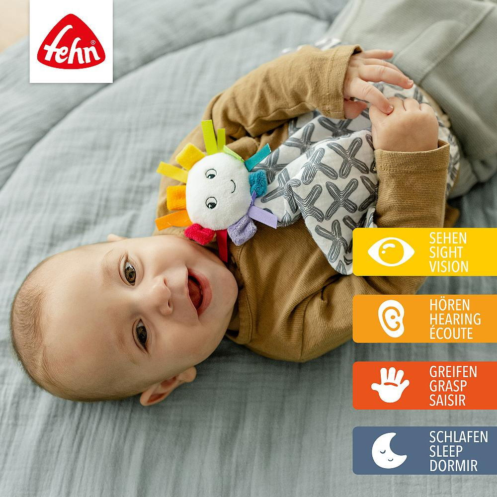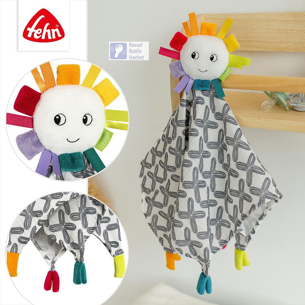 Jucaria-doudou Soare Vesel din colectia DoBabyDoo® Black & White Collection, perfecta pentru mangaieri, joaca si somn linistit._x000D_ Caracteristici:_x000D_ _x000D_ Creata din muselina moale de bumbac, in combinatie cu materiale prietenoase la atingere, aceasta jucarie multifunctionala este perfecta pentru imbratisat, linistit si stimulat simturile_x000D_ Cu elemente alb-negru cu contrast ridicat, ideale pentru stimularea vizuala timpurie_x000D_ Forma ideala pentru a fi prinsa usor de manutele miciMaterialele delicate si zornaitoarea discreta trezesc curiozitatea si bucuria descoperirii_x000D_ Perfecta pentru rutina de somn si momentele de relaxare_x000D_ Instructiuni spalare: verifica eticheta pentru a vedea daca sunt detalii specifice de curatare, scoate obiectele detasabile pentru a preveni deteriorarea, alege programul de spalare potrivit si la final usuca la aer_x000D_ _x000D_ Material exterior: muselina, velur, frotirMaterial de umplutura: 100% poliesterDimensiune: 38 cm  _x000D_ Varsta recomandata: 0 luni+_x000D_ Jucariile si accesoriile Fehn indeplinesc cele mai inalte standarde de calitate si siguranta pentru produsele de bebelusi si copii mici, fiind conforme cu Directiva europeana privind siguranta jucariilor 2009/48/CE si standardul european EN 71._x000D_ Produsele Fehn sunt testate temeinic in conformitate cu:_x000D_ _x000D_ EN 71-1 (Proprietati mecanice si fizice)_x000D_ EN 71-2 (Inflamabilitate)_x000D_ EN 71-3 (Migrarea anumitor elemente)_x000D_ EN 71-9:2005 (Compusi chimici organici)._x000D_ _x000D_ Atentie! Nu lasati ambalajele jucariilor/produselor la indemana copiilor. Indepartati orice ambalaj al jucariei/produsului inainte de a da jucaria/produsul copilului. Va rugam sa supravegheati copilul in timp ce se joaca/foloseste acest produs. Pastrati instructiunile si etichetele pentru referinte viitoare. Pastrati jucaria/produsul departe de foc, feriti jucaria/produsul de temperaturi ridicate si umiditate. Jucaria/produsul se poate curata cu o carpa usor umeda. Stergeti si uscati la aer imediat dupa curatare.