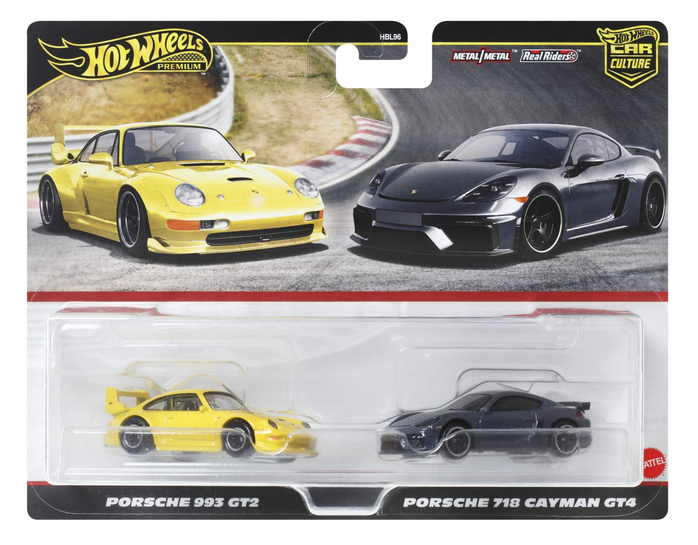 Fiecare masina metalica a duoului (la scara 164) este realizata cu atentie cu anvelope Real Riders, un sasiu metalic si decoratiuni autentice si detaliate. Cu cate 2 masini in fiecare set, pasionatii de masini au doua sanse sa-si gaseasca preferatele si sa inceapa sau sa-si extinda colectia! Acest set contine masinutele Porsche 993 GT2 si Porsche 718 Cayman GT4.