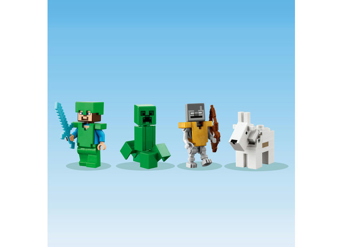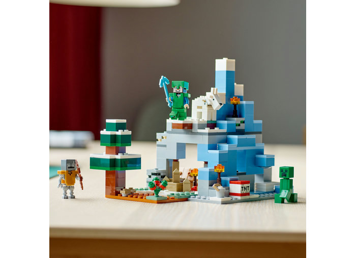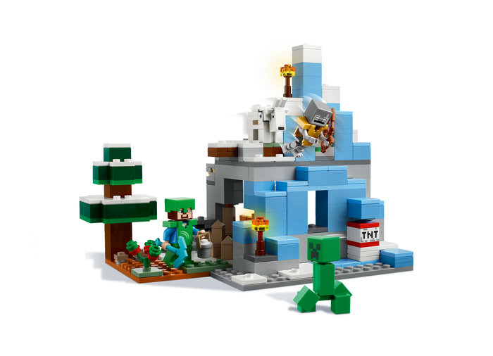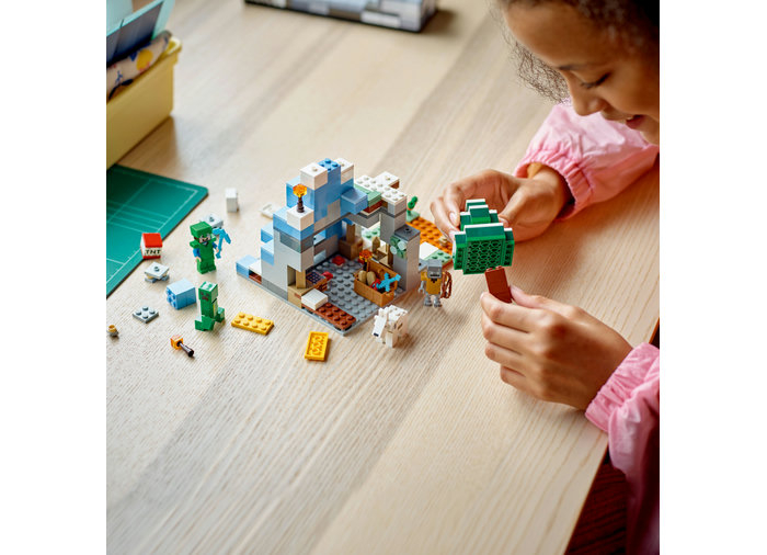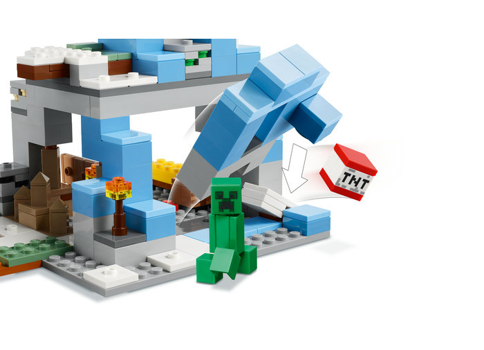 Jucătorii Minecraft vor recunoaşte Piscurile îngheţate şi taigaua şi vor fi nerăbdători să-şi folosească abilităţile din Minecraft pentru a extrage cărbune, fier şi smarald de sub gheaţă. Copiii trebuie să construiască un adăpost sigur şi să adune hrană înainte de a începeextracţia minereurilor. Când adversari emblematici, un Creeper™ şi un vagabond, se apropie prea mult, copiii pot scăpa fie prin periculoasa peşteră cu stalactite, fie folosind TNT ca să explodeze muntele şi să ajungă la adăpostul lor sau folosind funcţia de împungere a caprei ca să-i doboare pe mobii ostili de pe marginea stâncii! Mai multe dotări distractive şi o serie de accesorii autentice garantează că aventurile Minecraft nu se termină niciodată. Pentru mai multă distracţie creativă, aplicaţia LEGO Builder oferă instrumente intuitive de zoom şi rotire care permit copiilor să-şi vizualizeze modelul pe măsură ce-l construiesc.