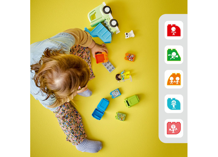 - Jucarie pentru educatie ecologica – Cu LEGO® DUPLO® Orasul meu Camion de reciclare (10987), cei mici invata despre sortarea deseurilor in timp ce se distreaza transpunand in joaca lor lumea pe care o observa in jur.
