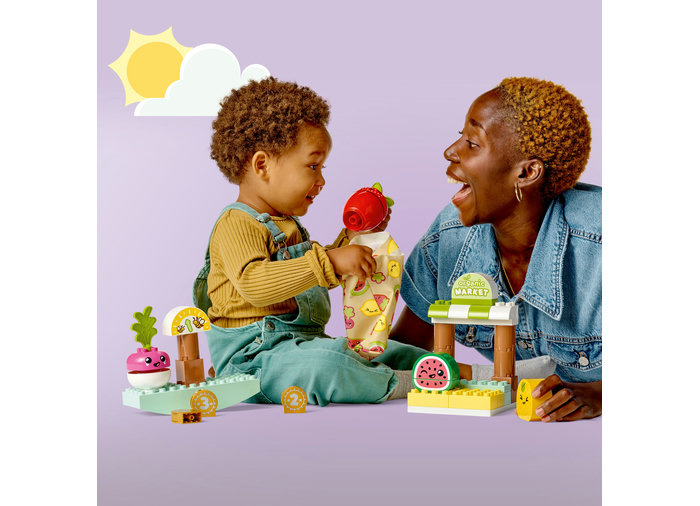Jucăriile LEGO DUPLO aşază distracţia fără limite, exprimarea de sine şi învăţarea veselă în mâinile copiilor. Acest set încurajează joaca interactivă între micuţi şi adulţi, care joacă rolurile unui vânzător de fructe şi legume şi unui cumpărător. Seturile DUPLO oferă ocazia părinţilor şi copiilor să împărtăşească etape de dezvoltare preţioase pe măsură ce construiesc şi se joacă împreună.