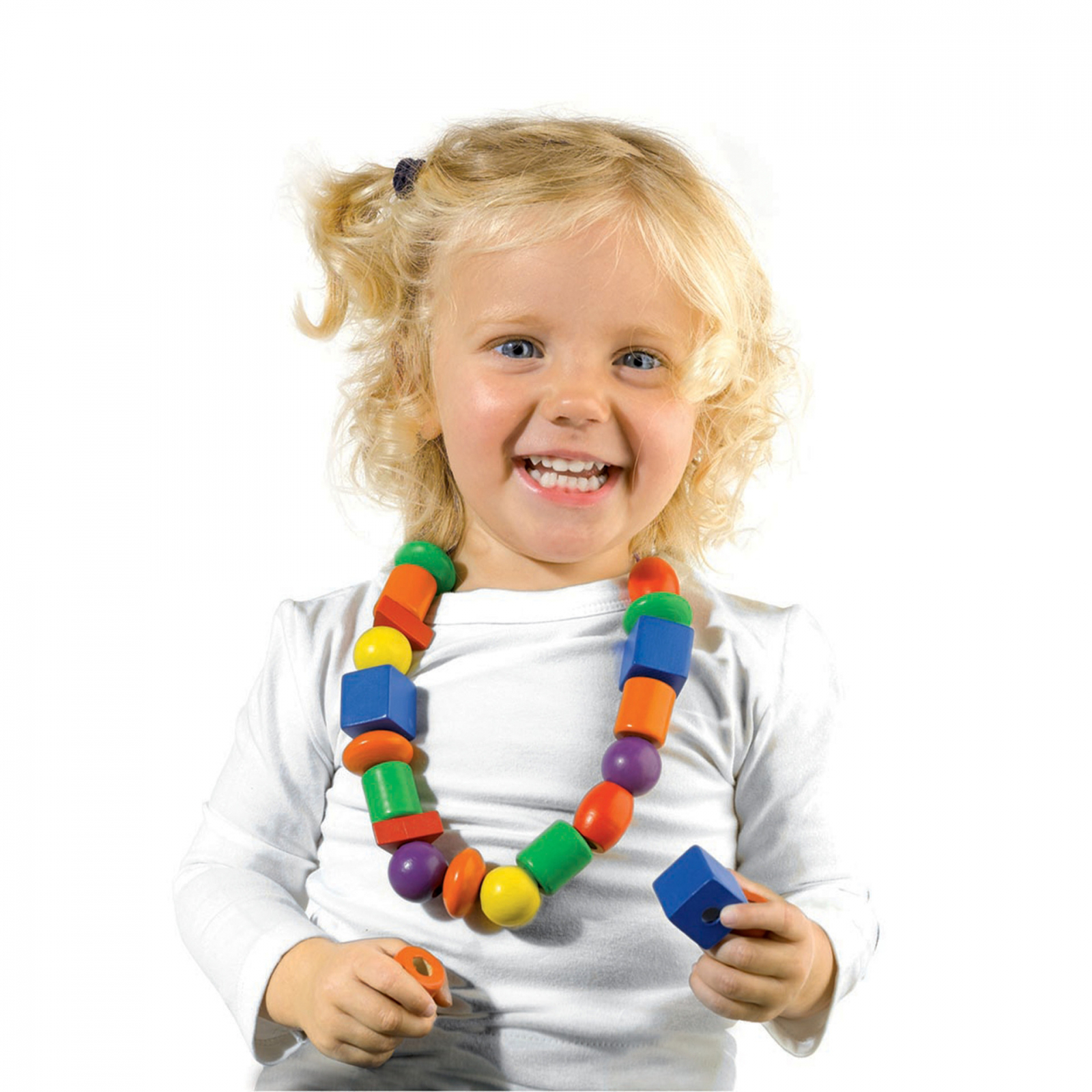 Cel mai bun mod de a invata cum sa faci ceva este prin practica, asa ca aceasta jucarie din lemn - set de insirat margele.  ofera oportunitatea perfecta de a face acest lucru intr-un mod sigur si distractiv. Un mod distractiv si unic de a invata sa insiri margele; setul contine optsprezece margele de diferite forme si culori cu gauri gata pentru a trece sfoara prin ele si apoi purtate ca un colier! O modalitate excelenta de a dezvolta abilitatile de coordonare mana-ochi la copiii mici. Contine: 18 x margele; 1 x snur. Dimensiuni: 15 x 20 x 4 cm.