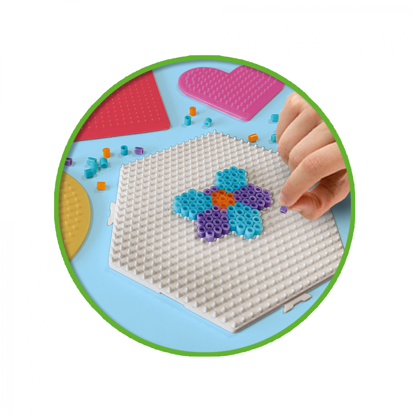 Diverse placi de calcat margele in diferite forme, astfel incat copiii si adultii sa devina creativi. Placile fac parte din colectia Green Beedz de la SES Creative, sustenabila alegere pentru calcat margele. Placile sunt realizate din polistiren reciclat, un plastic care este salvat de la usile vechi ale frigiderului. Contine: placa hexagonala ecologica; placa patrata ecologica; placa rotunda ecologica; placa inima ecologica. Dimensiuni: 15 x 20 x 4 cm.